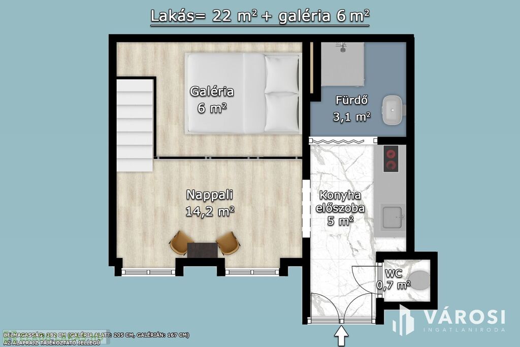 - Helyiségek: Előszoba-konyha, nappali, fürdőszoba, különálló WC