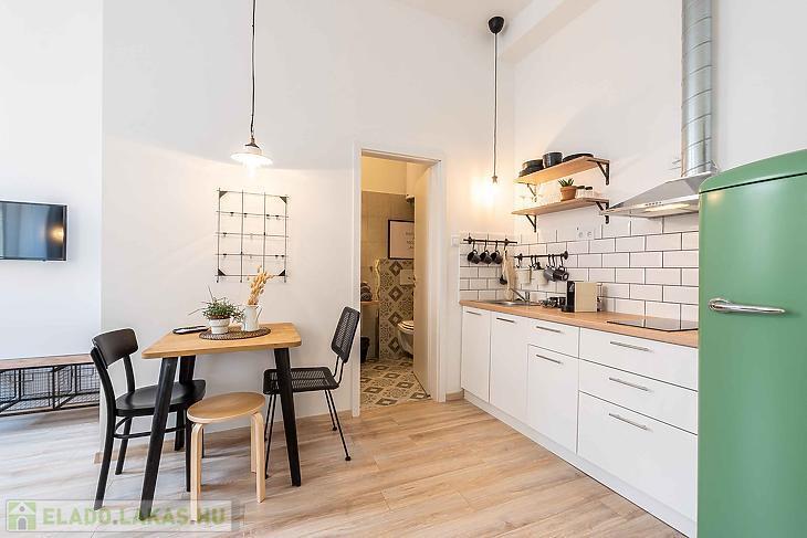Eladó felújított, 2 szobás lakás a VI. kerületi Dessewffy utcában – szép társasházban, használati megosztással! Eladásra kínálunk egy 30 négyzetméteres, teljes körűen felújított, 2 szobás lakást Budapest VI. kerületének egyik közkedvelt utcájában, a Dessewffy utcában. Az ingatlan egy jó állapotú, rendezett társasházban található, csendes belső udvarra néző ablakokkal, így a nyugodt lakókörnyezet garantált. A lakás ízlésesen felújított, modern burkolatokkal, új konyhával és korszerű fürdőszobával rendelkezik. Elrendezése praktikus: egy nappali, egy külön nyíló hálószoba, valamint egy zuhanyzós fürdőszoba került kialakításra. Az ingatlan használati megosztással rendelkezik, amely rendezett jogi háttérrel, ügyvédi dokumentációval került kialakításra. A környék infrastruktúrája kiváló: pár perc sétára található az Oktogon, az Andrássy út, a Nyugati tér és a 4-6-os villamos vonala is, így a közlekedés kiváló. Éttermek, kávézók, üzletek, valamint kulturális programlehetőségek széles választéka érhető el a közelben. Ideális választás fiataloknak, egyetemistáknak vagy befektetés céljára, kiadásra is tökéletes lehetőség. Az adatok tájékoztató jellegű.