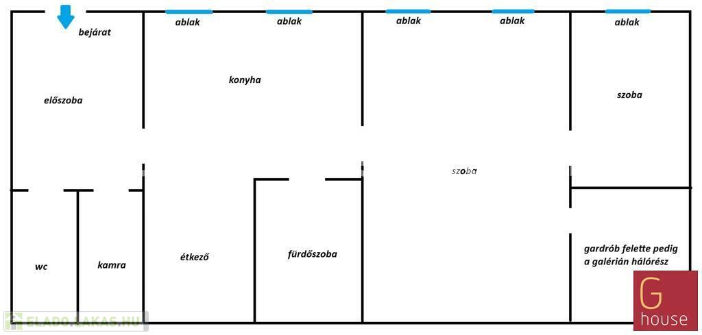 A lakás elrendezése rendkívül praktikus: tágas nappali, étkező, külön gardrób, kamra, valamint egy galériázott hálófülke két fő részére. A gardrób kialakítása miatt a lakás tágas és szellős, mivel nincs szükség külön szekrényekre.