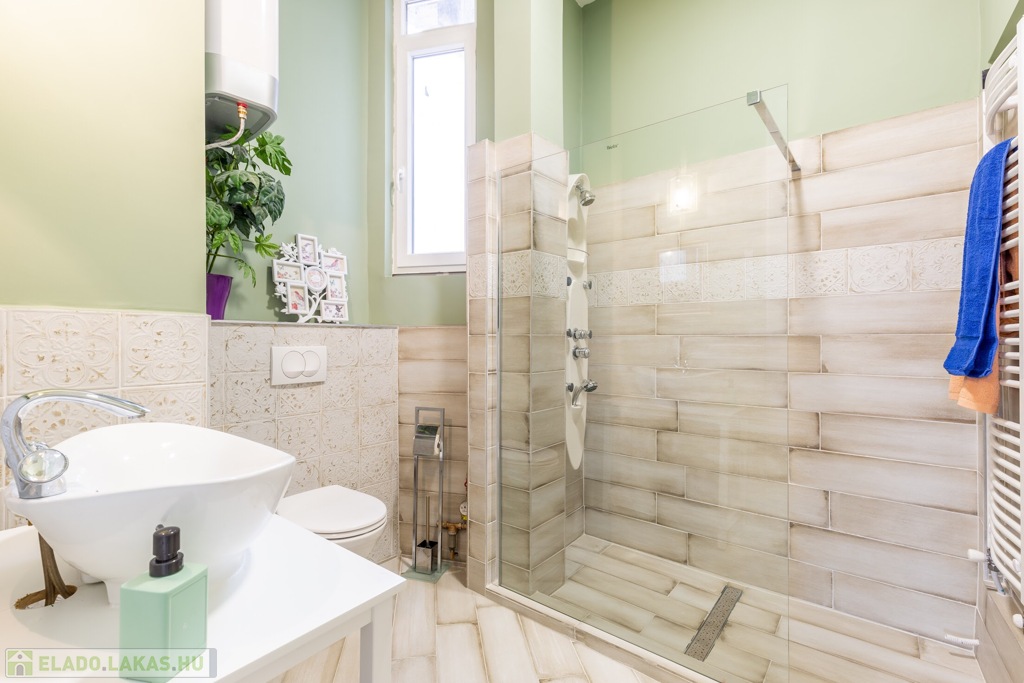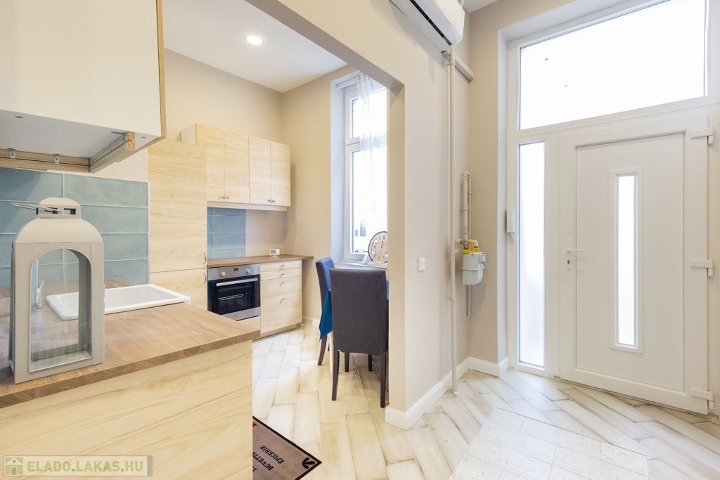 Jelenlegi kialakítás szerint, egy kis-szobányi gardrób áll rendelkezésre, vendégszobával, berendezett, igényes konyhával. A nagy ablakos fürdő szintén teljesen felújított, fa hatású csempével, és igényes zuhannyal van ellátva.