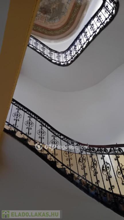 Gyönyörű, freskóval díszített lépcsőházban az első emeleten helyezkedik el a lakás, két bejárati ajtóval rendelkezik, amelyekből az egyik a lépcsőházból, a másik a körfolyosóról nyílik. 4,1 méteres belmagassága, hatalmas három méteres fa ajtajai tágas teret biztosítanak. A belmagasság miatt praktikusan galériázható.