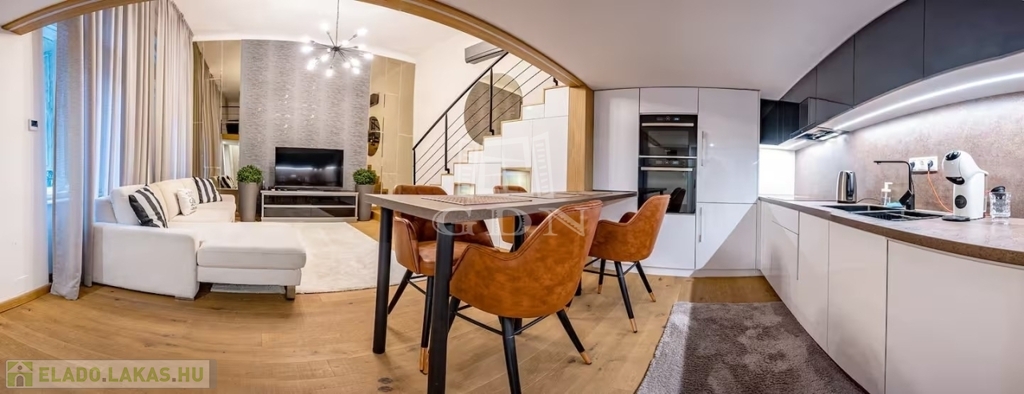 A lakás teljes körű felújításon esett át, ahol a klasszikus és a modern stílus tökéletes egyensúlyban találkozik: