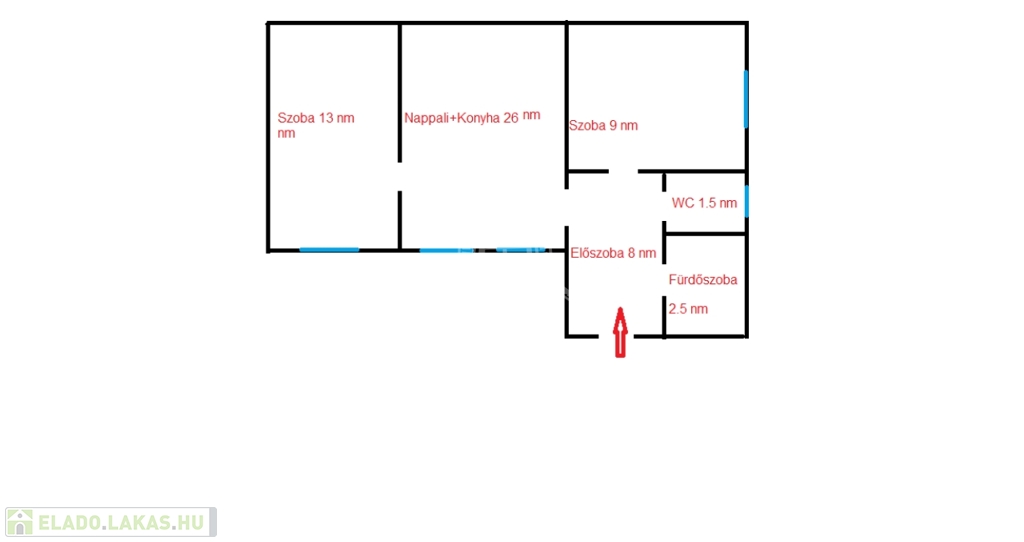 Az előszoba ajtóval szemben találjuk a 10 nm-es szobát, bal oldalon lépünk a 26 nm-es amerikai konyhás nappali helyiségbe, innen nyílik a 13 nm-es hálószoba.