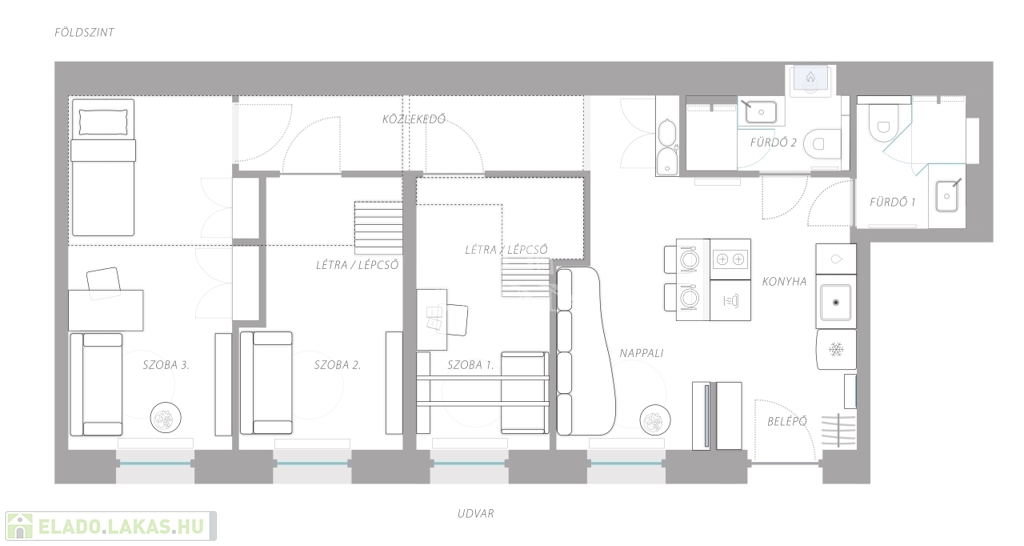 A lakás ablakai a csendes belső udvarra néznek, ahol biciklik tárolása is biztonságosan megoldható. Az ingatlan teljesen gépesített és berendezett: beépített sütő, indukciós főzőlap, mosogatógép, hűtő fagyasztóval, nagy TV több száz csatornával, üvegszálas nagy sebességű internet.