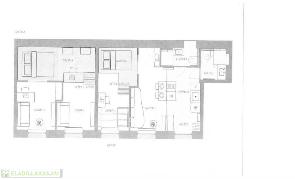 A tulajdoni lap szerint 71 nm-es alapterület a nagy belmagasság révén galériás megoldásokkal bővült.