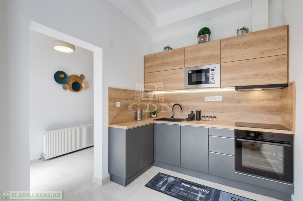 Az ingatlan elrendezése kiváló: amerikai konyhás nappali, két hálószoba, valamint fürdőszoba wc-vel. A lakás teljes körű felújításon esik át, jelenlegi készültsége kb. 70%, a befejezés várhatóan 60 napon belül történik meg.
