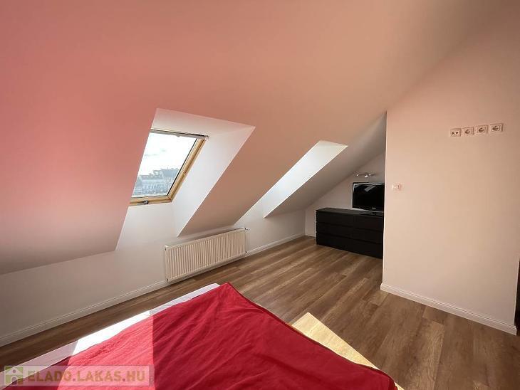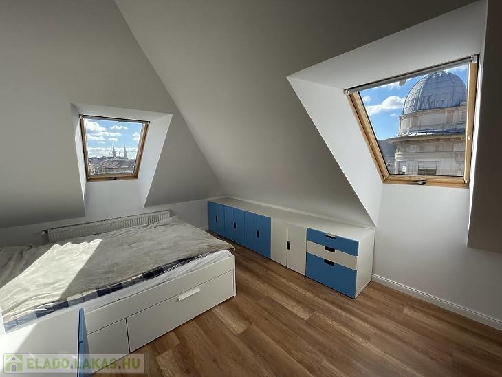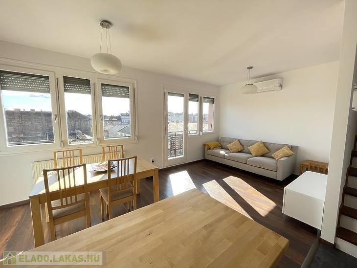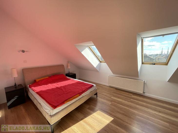 Eladó a VII. kerületben, a Jósika utcában, a Szenes Hanna park mellet egy igazán különleges hangulatú, panorámás kilátással rendelkező, nettó 60, bruttó pedig 80 nm-es, belső kétszintes (duplex) lakás egy 2007-ben épült, liftes társasház 5. emeletén.