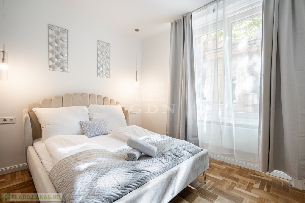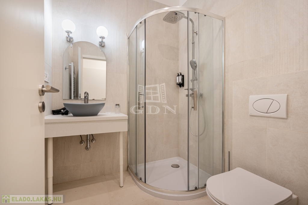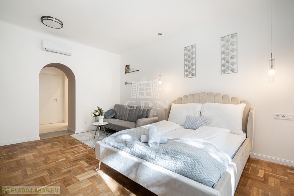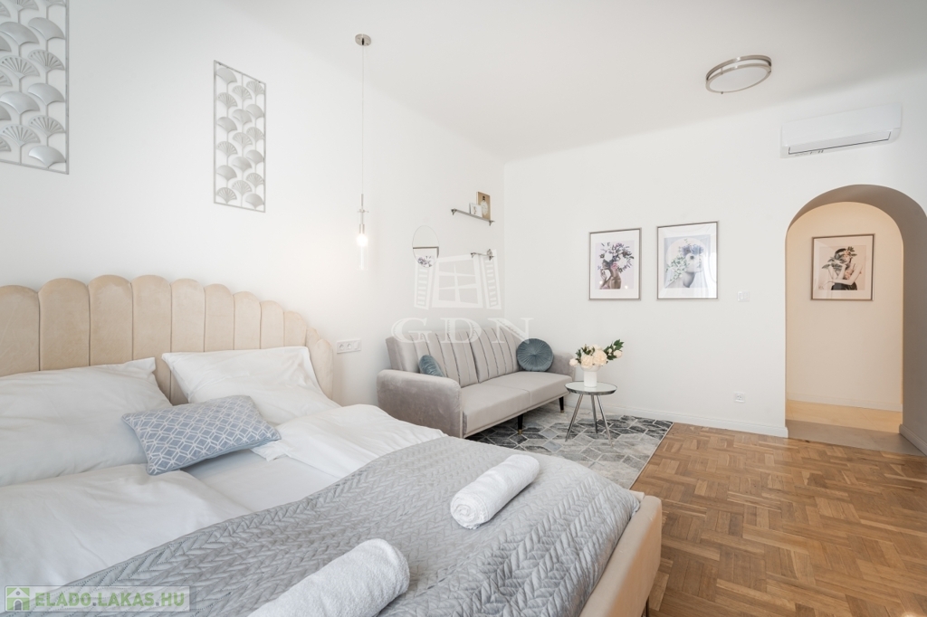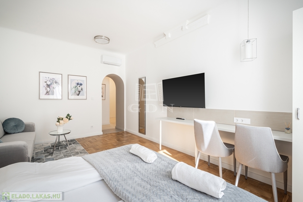 A nettó 64 m²-es lakás két különálló, önálló egységből áll, amelyek mindegyike saját fürdőszobával és konyharésszel rendelkezik. A felújítás néhány éve történt, a helyiségek klimatizáltak, a fűtést elektromos panelek biztosítják. Az ablakok a csendes belső udvarra néznek.