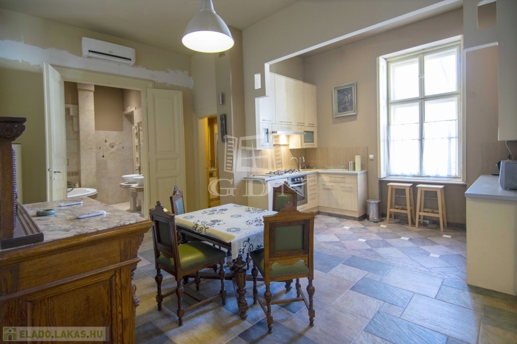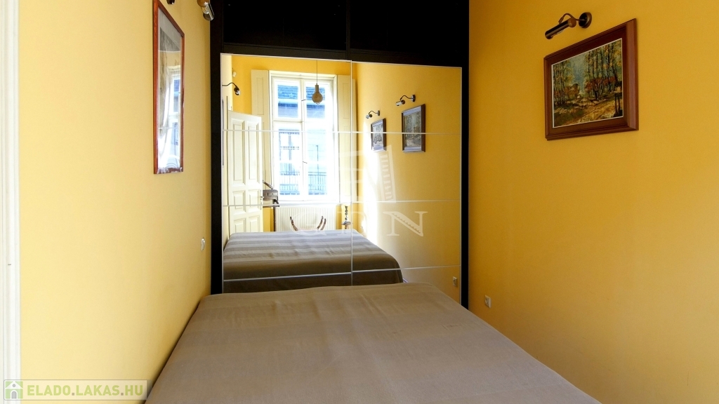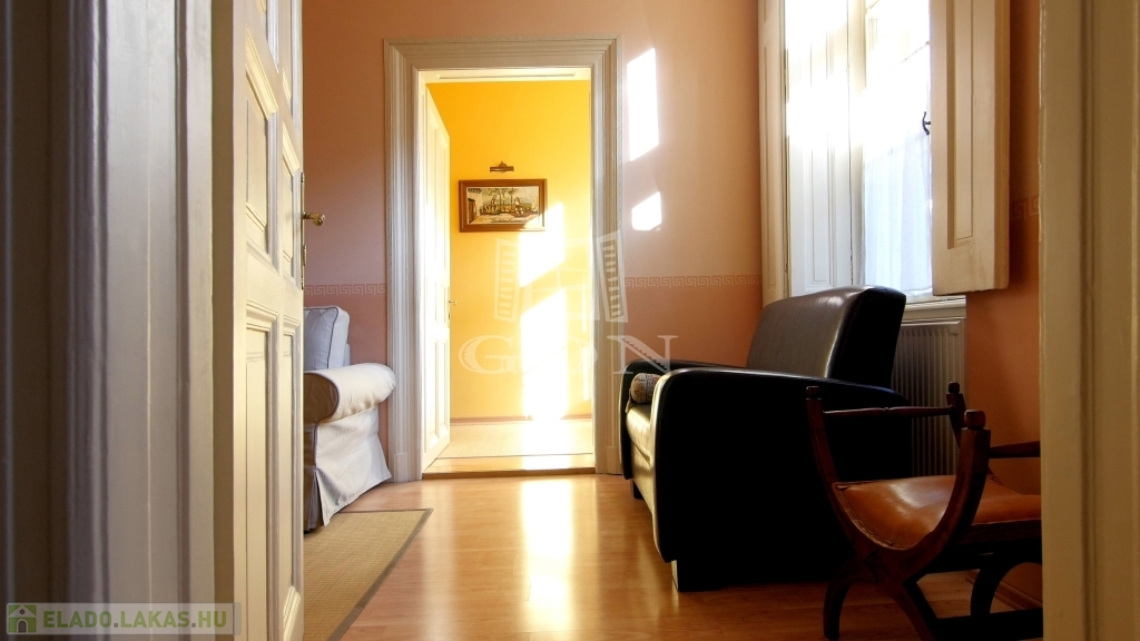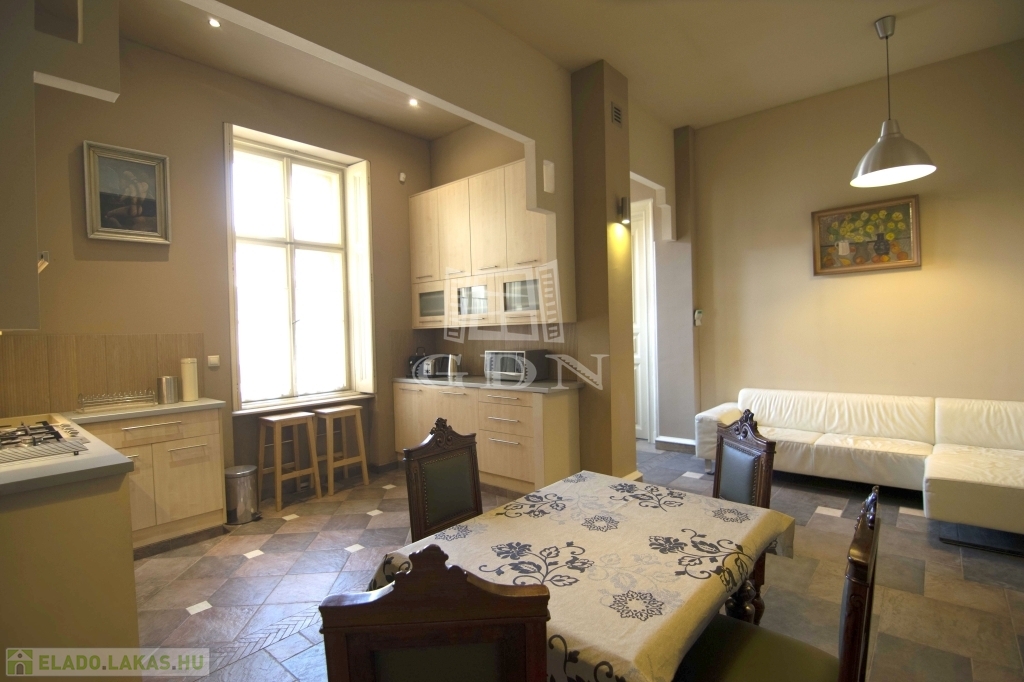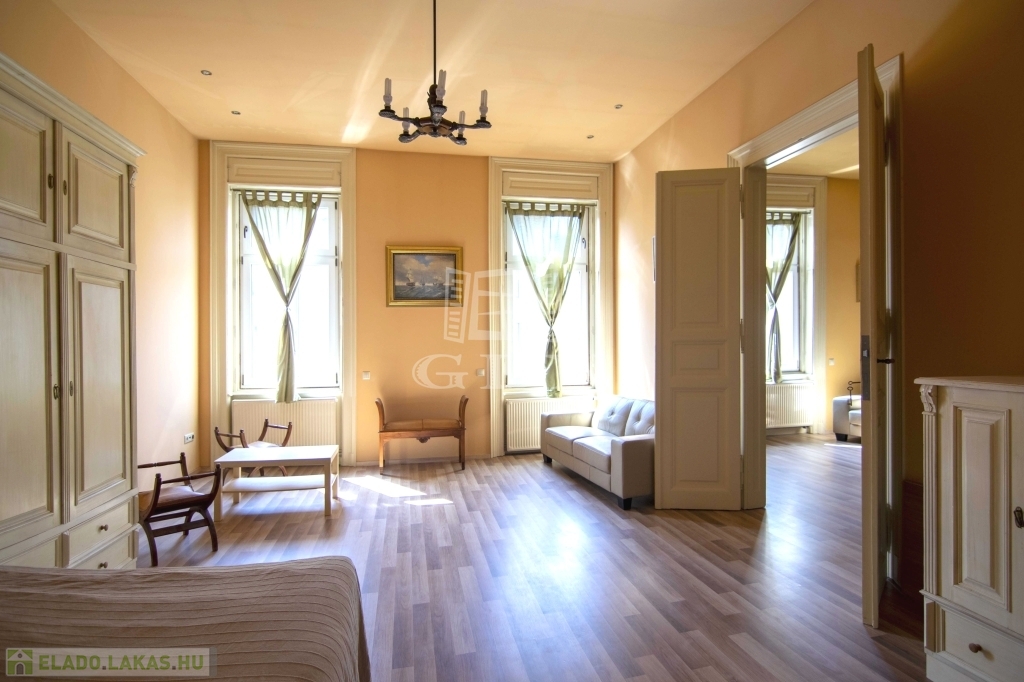 Belvárosban, turisztikailag frekventált helyen, (Blaha Lujza tér közelében) legfelső emeleti, két külön bejáratos lakrésszel rendelkező, napfényes nagypolgári lakás eladó.