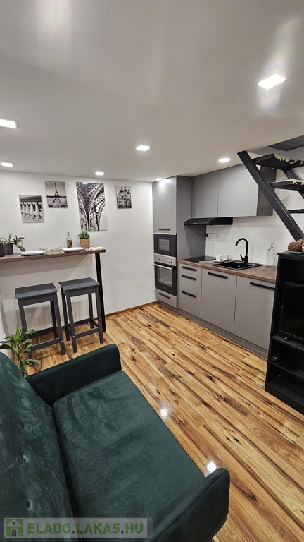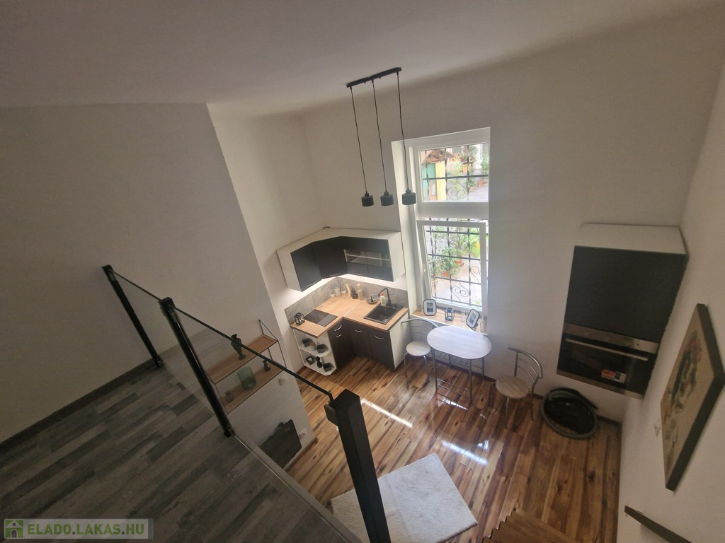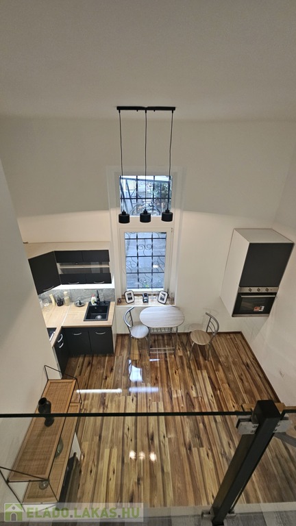 Amerika konyhás nappali, zuhanyzós fürdőszoba kerül kialakításra, a galéria pedig hálórésznek lesz kialakítva. A szoba ablak udvarra néző. A lakás külön bejárattal rendelkezik.