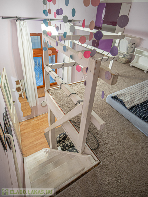 A nagy belmagasságnak köszönhetően egy kb 8nm-es, masszív galéria került kialakításra ami hálószobaként is funkcionál.