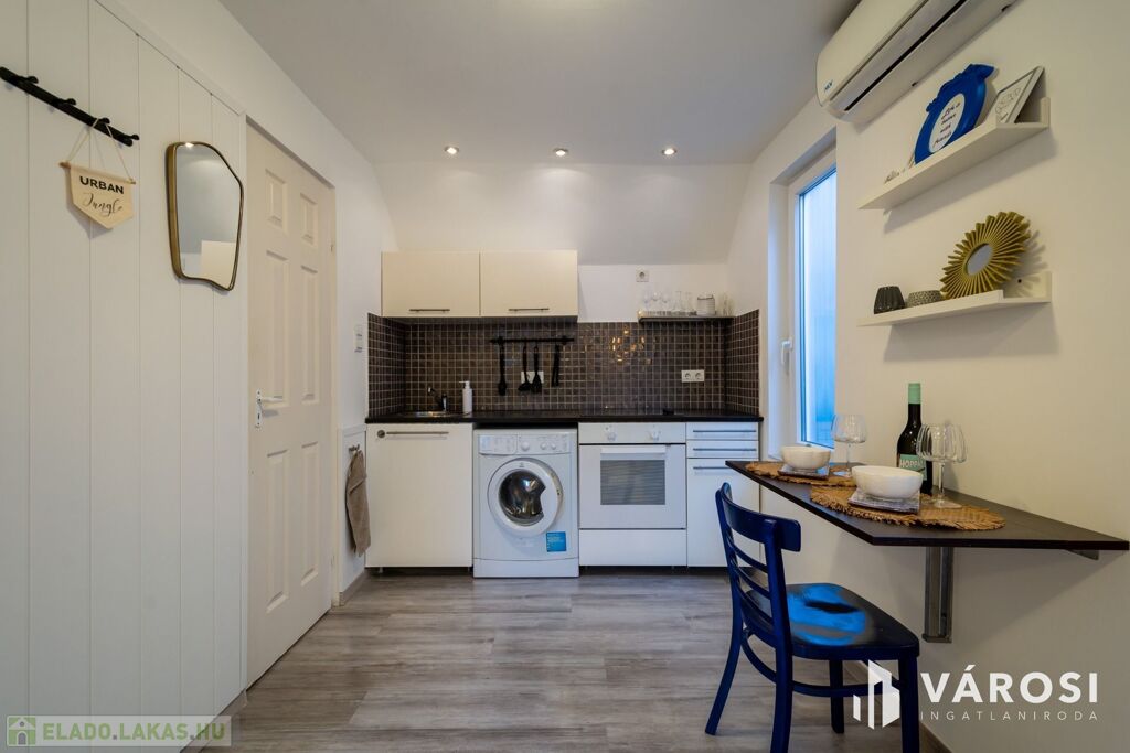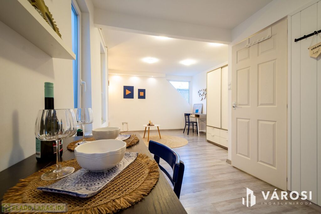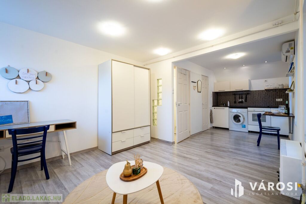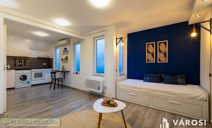 A sok ablaknak köszönhetően rendkívül világos a lakás, fiatalos berendezéssel, és egy garzonhoz képest kifejezetten tágas térrel rendelkezik.