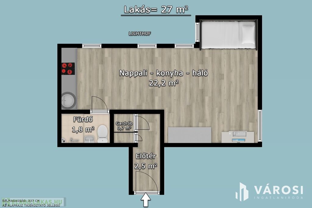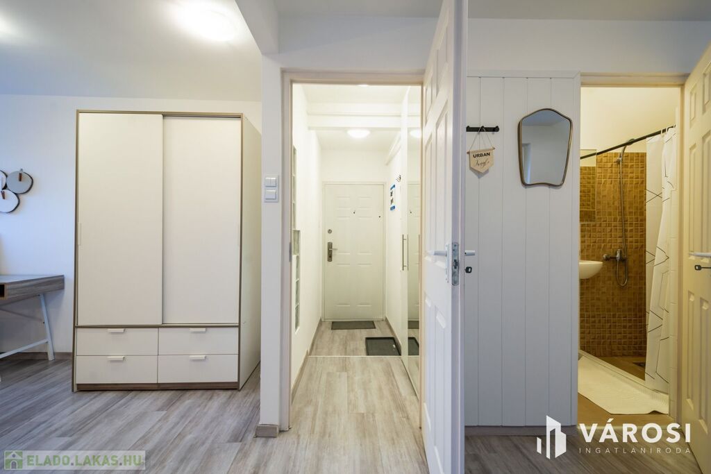 Egy előszobából lépünk a nagyméretű szobába, ami a nappali - konyha -háló funkciót látja el, valamint egy zuhanyzós fürdőszobát találunk még itt.