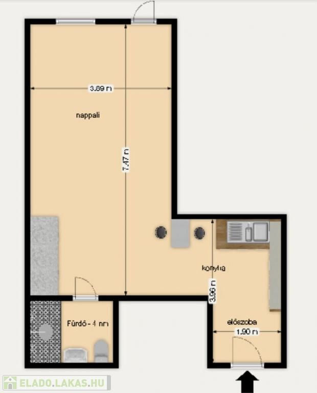 az egyik oldalon beépített szekrény, a másikon nappali/háló
