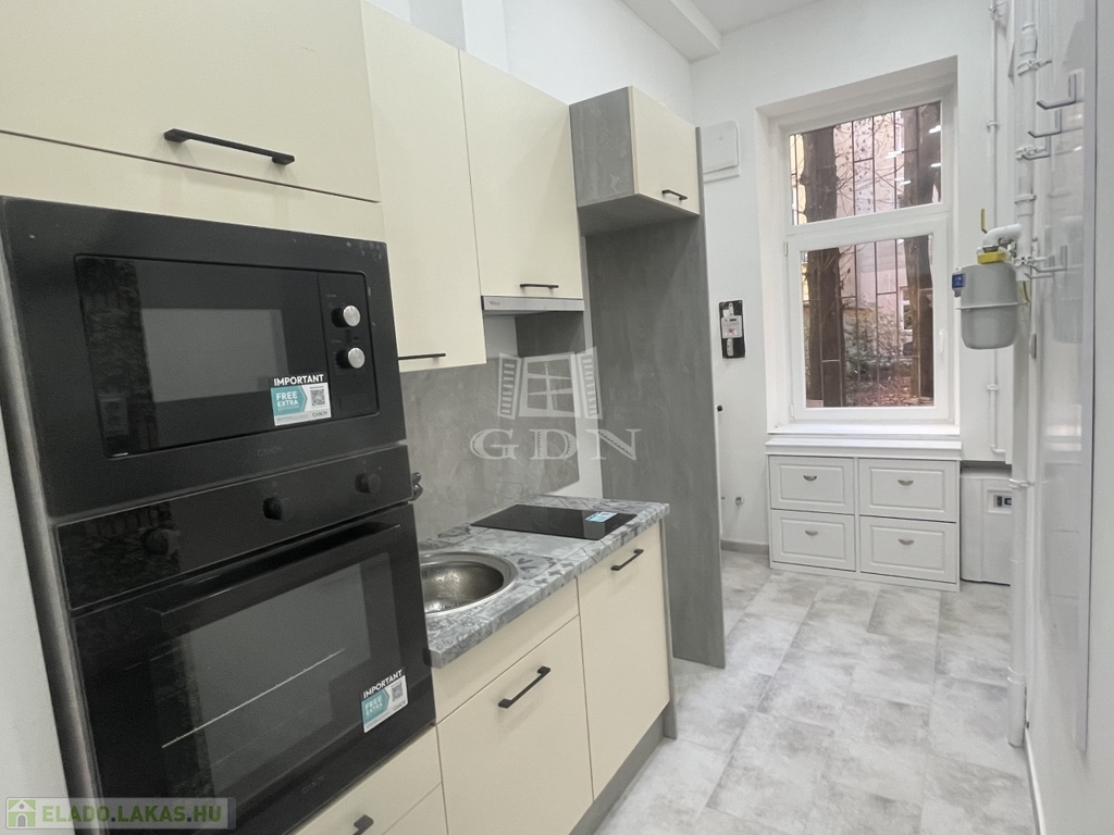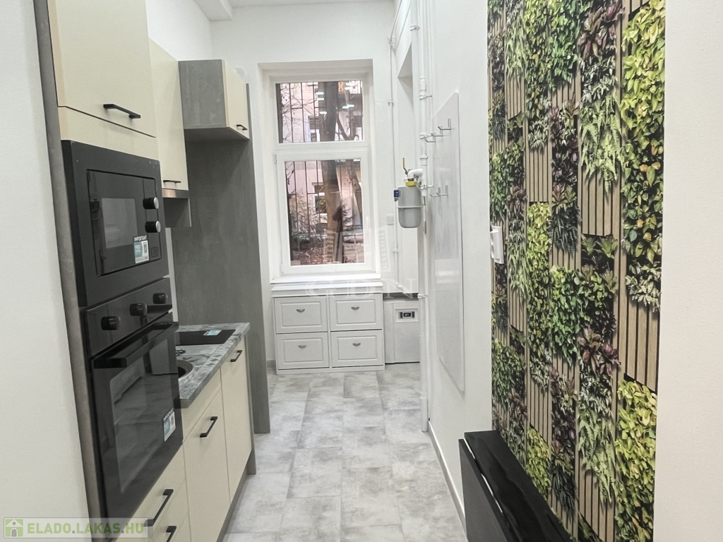 Gépesített konyha: mosogatógép, sütő, mikró, főzőlap, kivezetett elszívó, hűtő