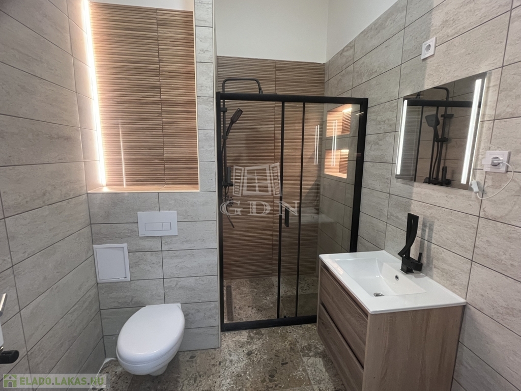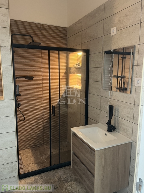 Fürdőszoba: mosdószekrény, törülközőszárító, modern zuhanykabin elhúzható ajtóval
