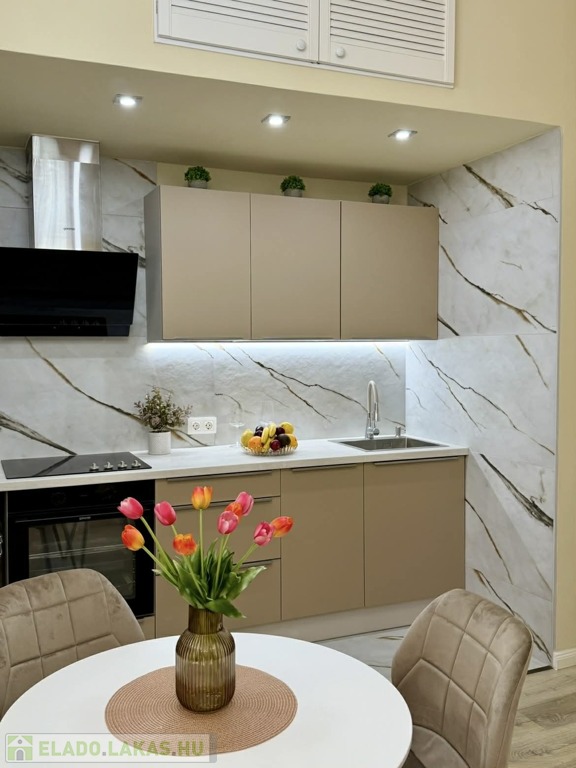 A felújítás mindenre kiterjedt: új burkolatok, új víz- és villanyvezetékek, aljzat födémig visszabontva és új betonréteggel kialakítva. Modern, fiatalos esztétika, minőségi konyhagépek – ide valóban csak költözni kell.
