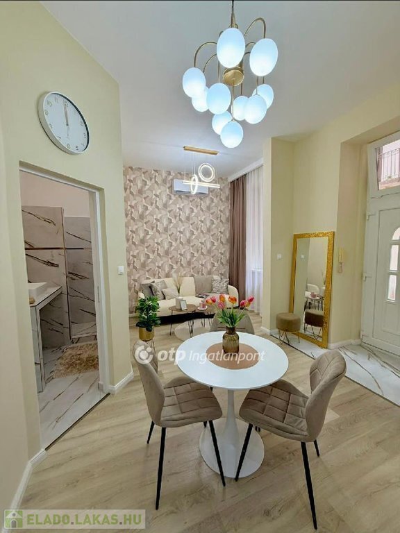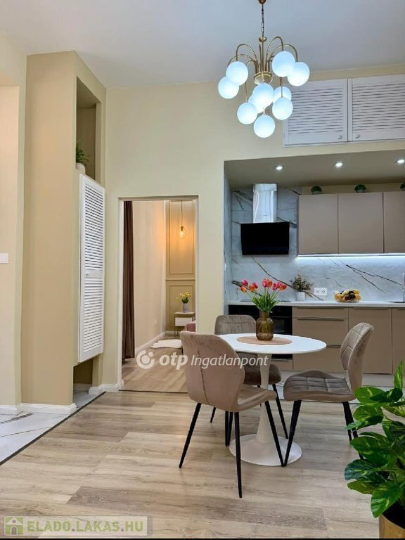 Az esztétikáról minőségi és stílusos anyagok gondoskodnak, a TELJES BERENDEZÉS a vételár részét képezi ( hűtő-fűtő klíma, mosogatógép, páraelszívó, bútorok és kiegészítők ), igazi beleszeretős kis lakás!