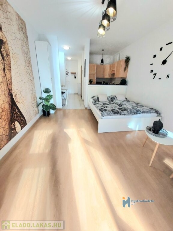 Az ingatlan lakóterülete 32 nm, mely tágas, zuhanykabinnal ellátott fürdőszobából, a szobától elszeparált de mégis nyitott konyhából, és parkosított udvarra néző szobából áll.