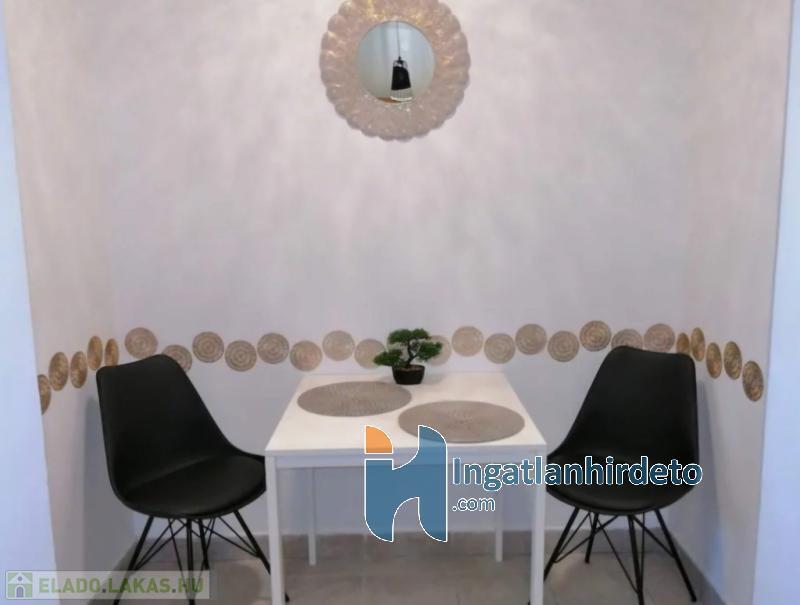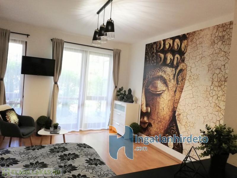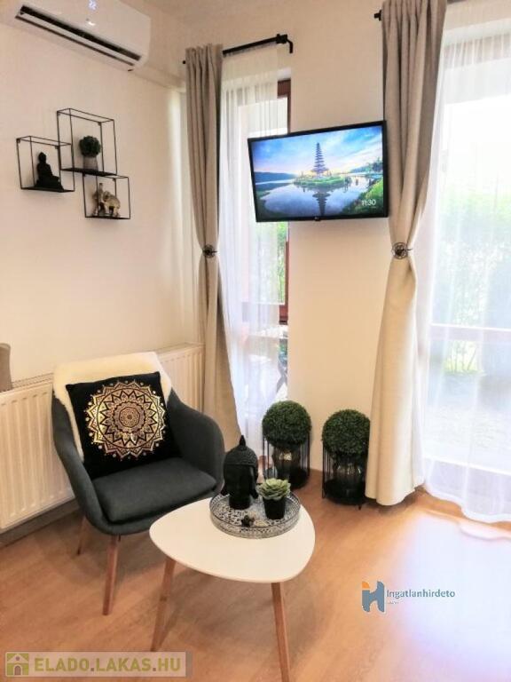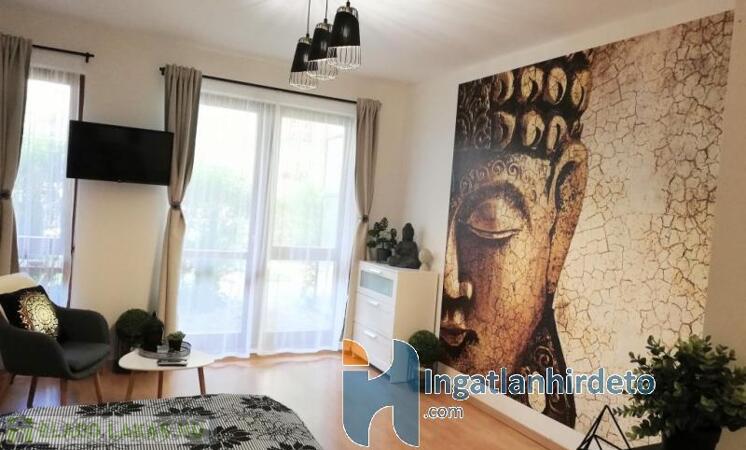 Az ingatlan lakóterülete 32 nm, mely tágas, zuhanykabinnal ellátott fürdőszobából, a szobától elszeparált de mégis nyitott konyhából, és parkosított udvarra néző szobából áll.