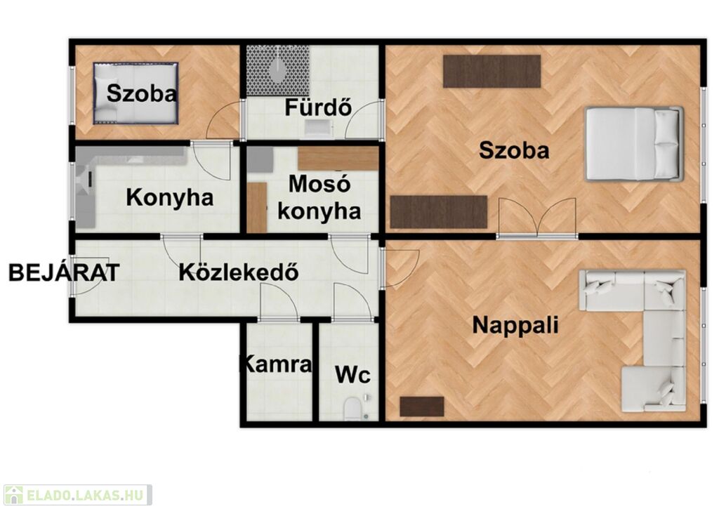 -82nm-es lakás(konyha, fürdőszoba,nappali, 3 szoba, előszoba, wc és kamra)
