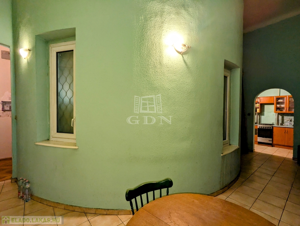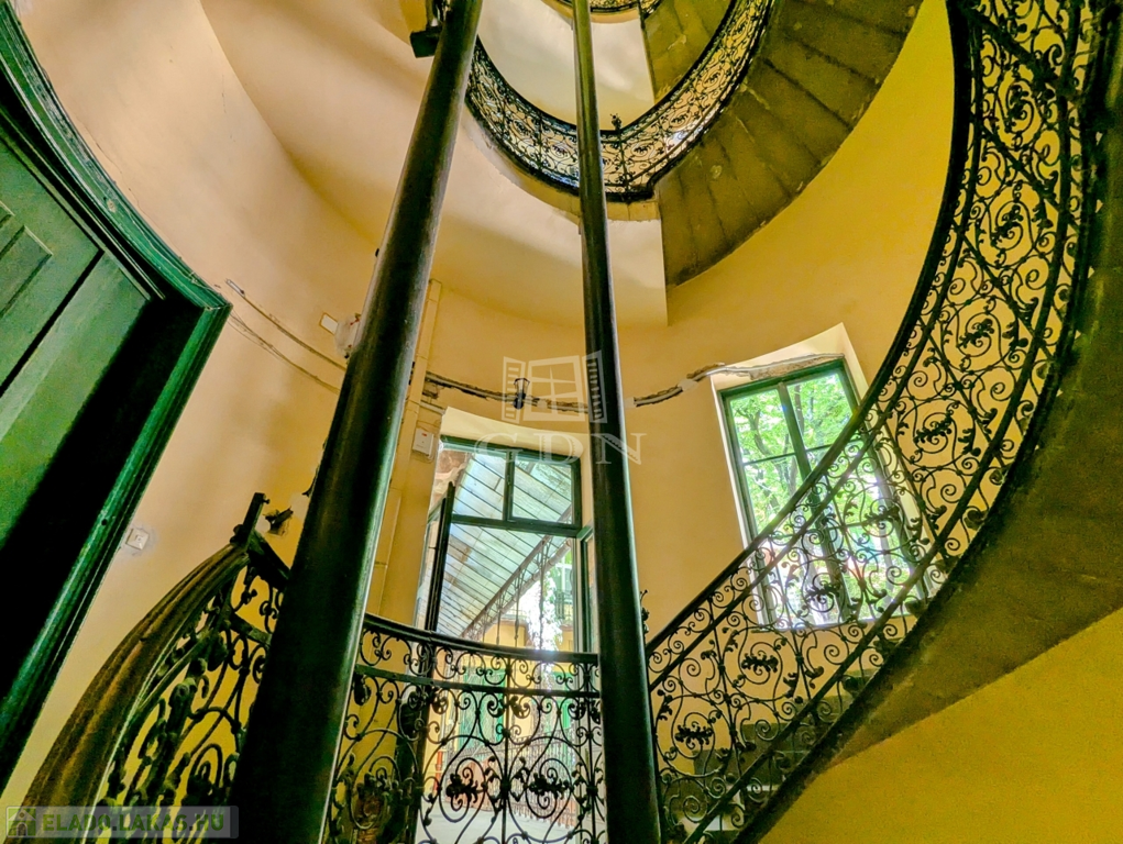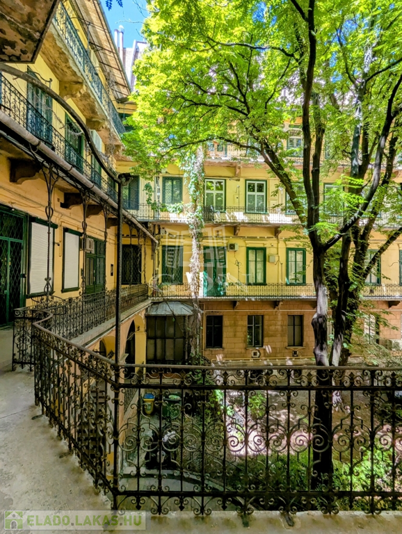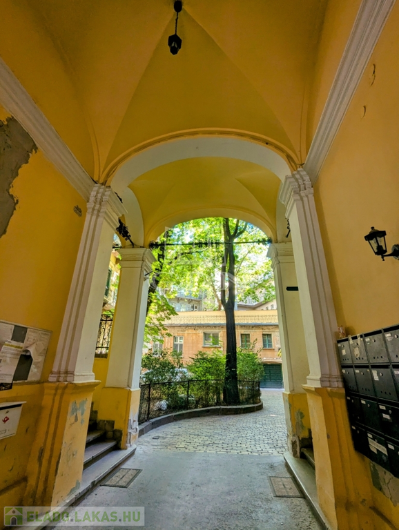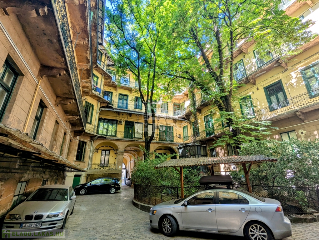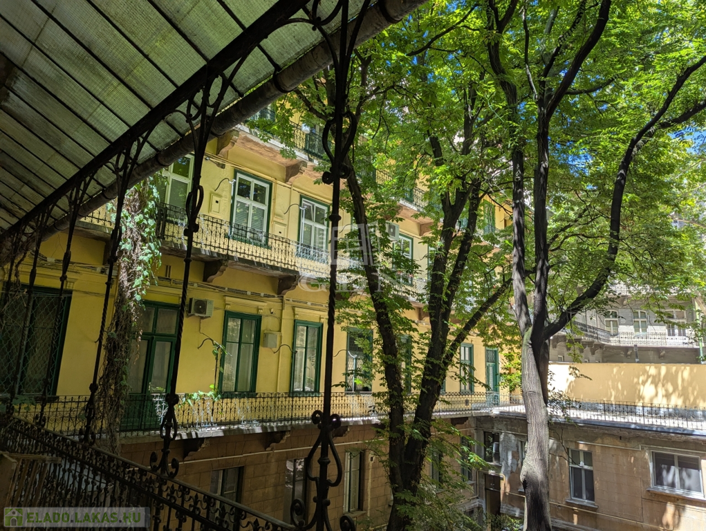 Az ingatlan egy 1880 körül épült, eklektikus-neoklasszicista társasház első emeletén található, vastag falakkal, hatalmas belmagassággal (4,6 méter!), és egyedi, köríves alaprajzi megoldással. A ház tágas, zöld belső udvara hangulatos, fákkal és bokrokkal övezett oázis a város szívében. A jelenlegi tulajdonosnak ritka lehetőségként saját kocsibeálló része is van az udvarban.