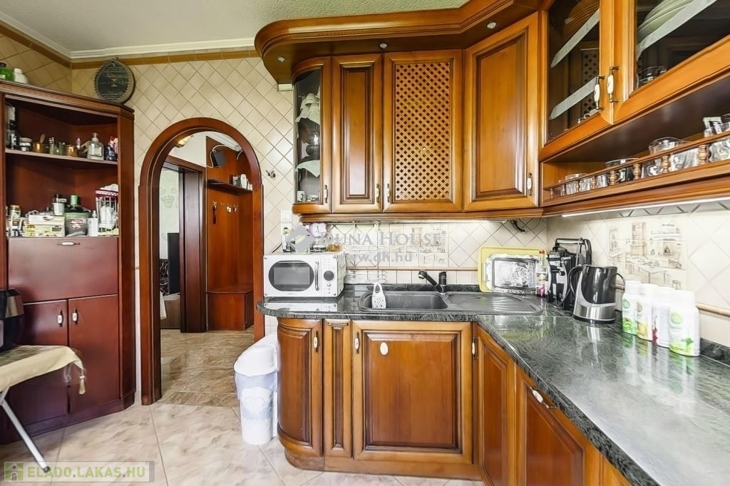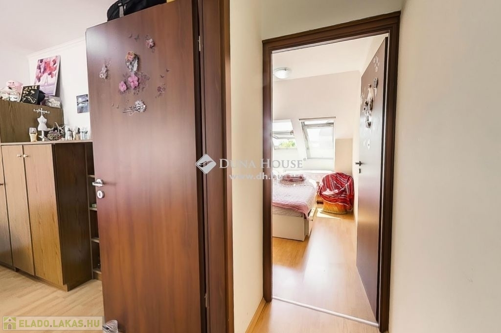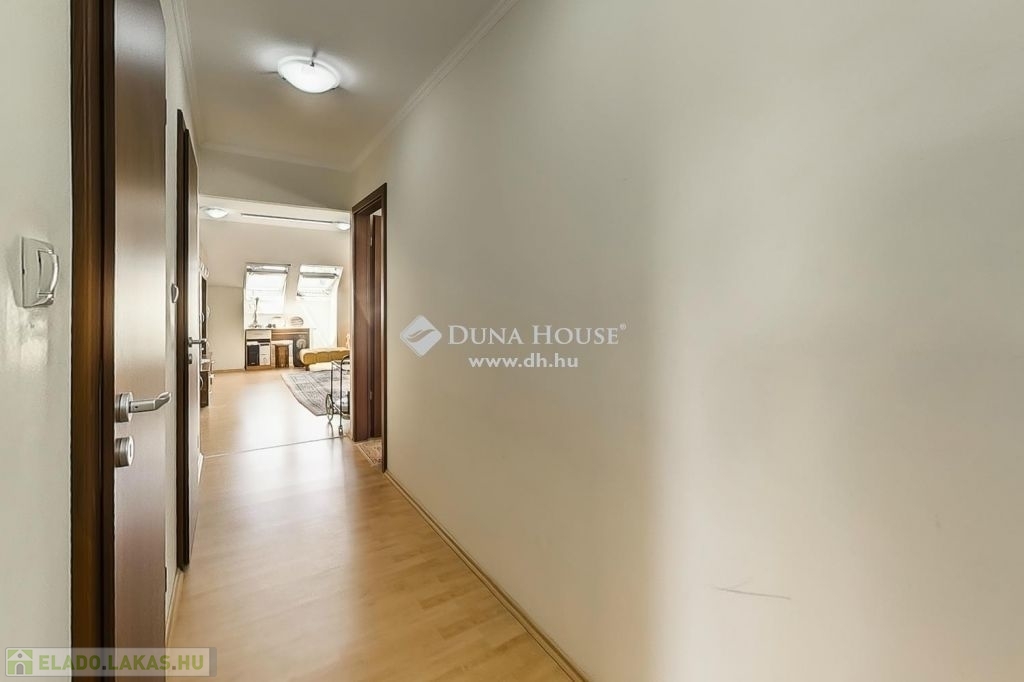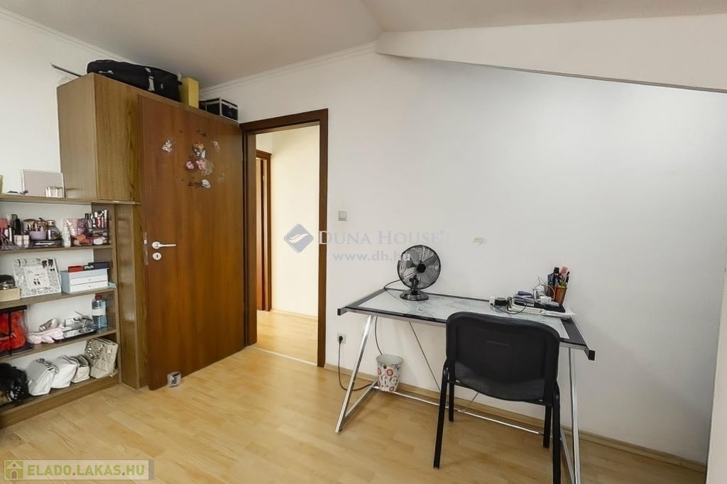 A felső szintén egy nagy világos nappali szobába érkezünk ahonnan egy folyosón keresztül jutunk el a 3 halószobába és itt van a fürdő és a wc is.A fűtés és meleg víz házközponti egyedi mérőkkel. A felső szinten klíma biztosítja nyáron is a kellemes klímát. A lakáshoz tartozik 2 autóbeálló is.