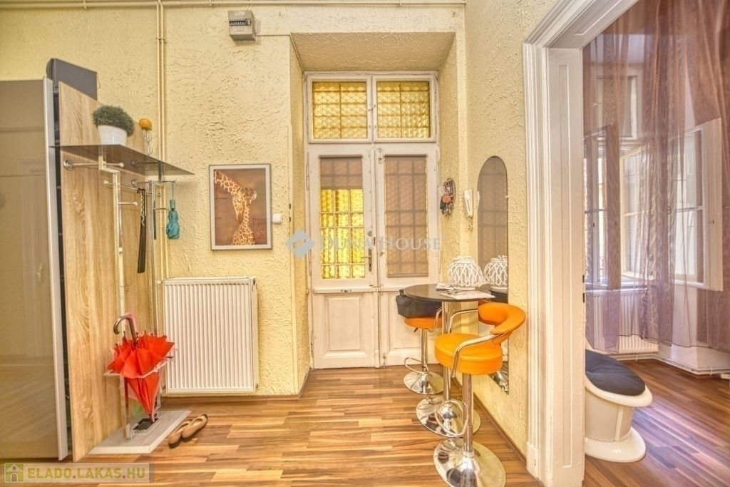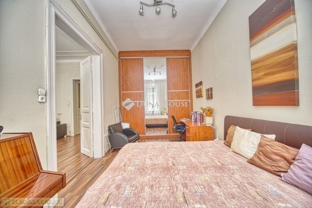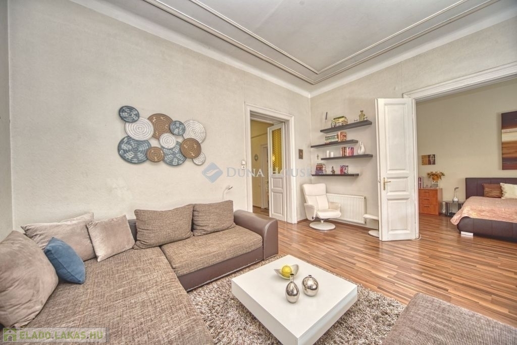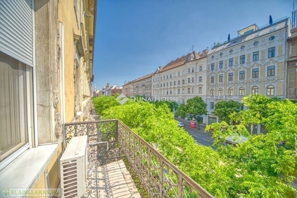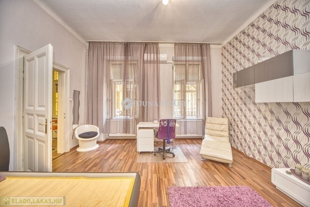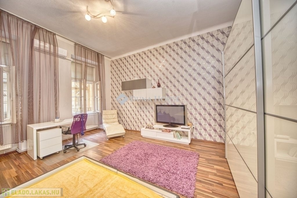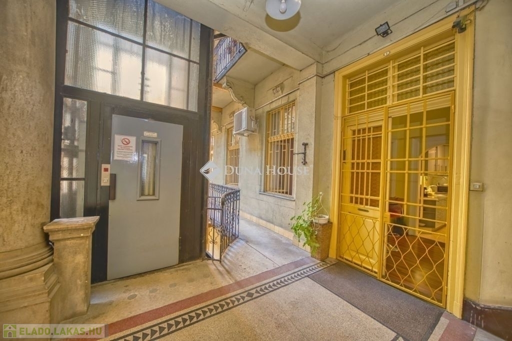 PALOTANEGYEDBEN!Mit ajánlok Önnek? A tökéletes belvárosi élet lehetőségét.A lakás Budapest VIII. kerületében, a Palotanegyedben, egy klasszikus, 1890-es években épült belvárosi épületben található.Az eklektikus stílusban épült társasház első emeletén egyedi adottságokkal rendelkező ingatlant ajánlok a figyelmébe.A környék kulturálisan gazdag és történelmi hangulatú, mely lakó- és üzleti célra is kiváló lehetőségeket kínál.A családi otthon 2015-ben esett át egy teljes felújításon ahogy ezt a képek is tökéletesen tükrözik.Ennek köszönhetően a konyha és a fürdőszoba felújítása megvalósult, a nappali ablaka már műanyag típusú nyílászárók vannak, elektromos redőnnyel ellátva. A hálószobai ablak is korszerű műanyag.A burkolatok újszerűek, a kellemes hőérzetről 2 db klíma gondoskodik.A 31 nm.es nappali a családi élet színtere, sőt erkély kapcsolatos is.A fűtés és a melegvíz ellátás cirkóról történik, a fűtés számla kb. havi 19,000, Ft.A közös költség 29,200, Ft, a lakás rezsije alacsony.A vételárrészét képezi a beépített gépesített konyhabútor, a 2 db klíma, a hálószobai gardrób szekrény, és a két nagyszekrény.Miért jó választás ez a lakás?A 107 m2-nek köszönhetően egy nagyon tágas lakásról beszélünk ennek köszönhetően tökéletes választás lehet családok részére, akár egy irodának is nagyon jól kialakítható az ingatlan.Világos a nagy ablakoknak köszönhetően, érezheti az egész napos természetes napfényt.Kiváló közlekedés néhány perc séta a 2-es metró, a 4-6-os villamos. Budapest bármely pontját, rövid időn belül elérhetjük.A környéken mindent megtalál, amit csak szeretne, éttermek, kávézok, bevásárlóhelyek csupán néhány perc sétára már meg is találhatja, amit szeretne.Ha bármi kérdése merülne fel hívjon fel bátran és szívesen állok rendelkezésére bármilyen kérdése van!Az ingatlan a Palotanegyed minden vonzó gasztronómiai, kulturális lehetőségéhez közel helyezkedik el.Belvárosi elhelyezkedés ellenére a lakás csendes és nyugodt környezetet biztosít. Ne hagyja ki ezt a ritka lehetőséget! Érezze át a tökéletes belvárosi életet hívjon még ma és nézze meg személyesen ezt a különleges lakást.