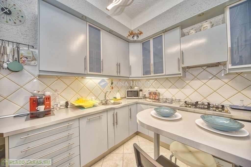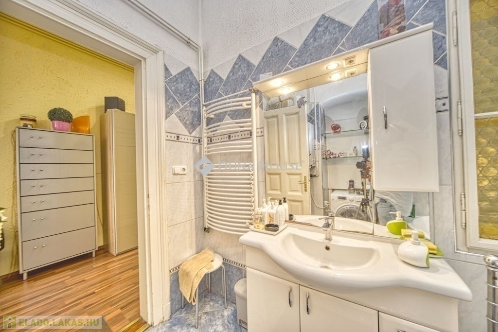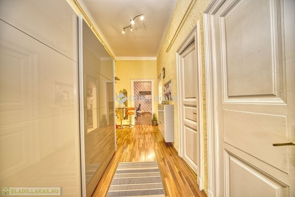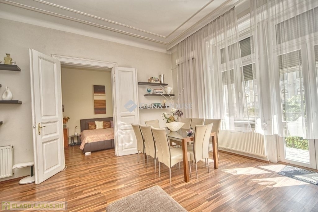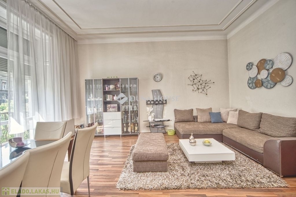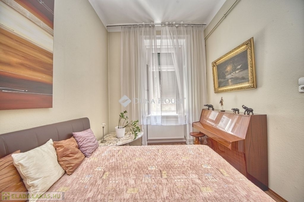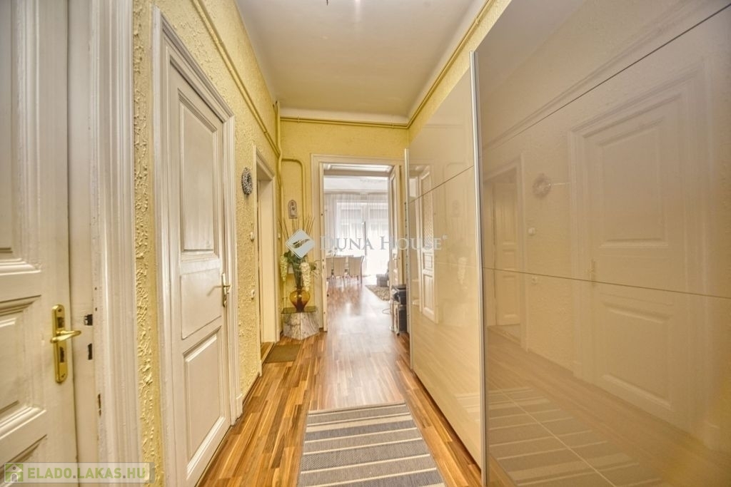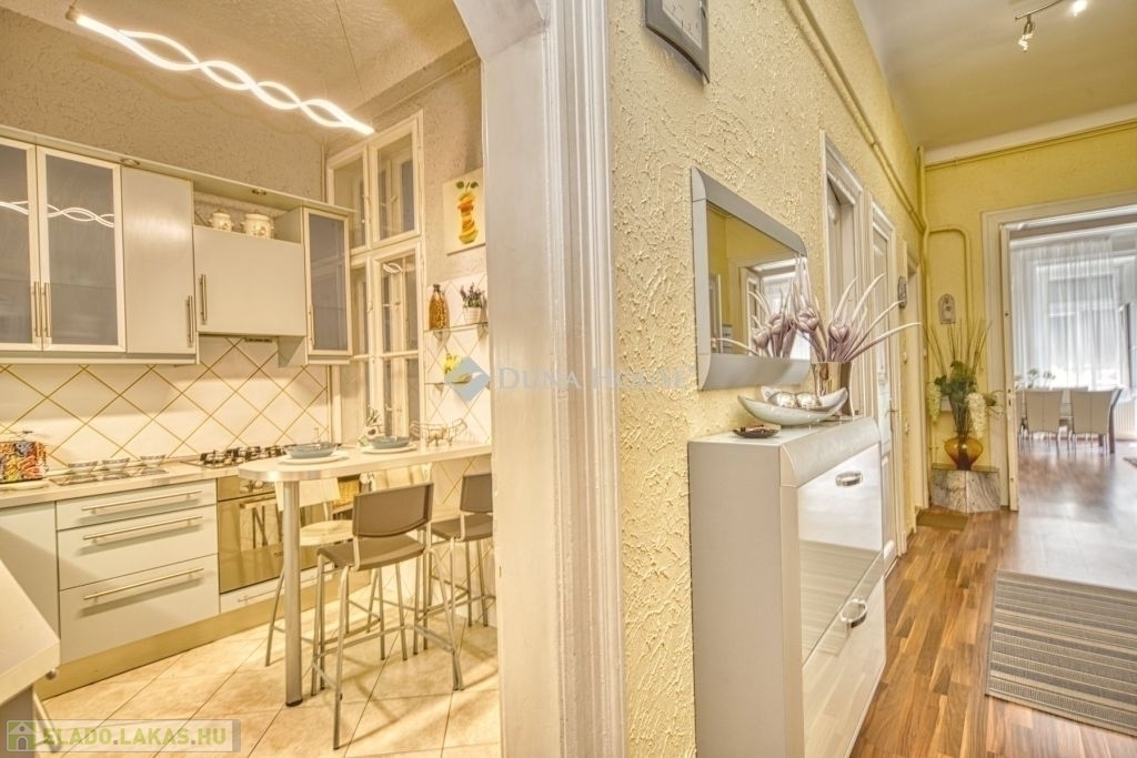 PALOTANEGYEDBEN!Mit ajánlok Önnek? A tökéletes belvárosi élet lehetőségét.A lakás Budapest VIII. kerületében, a Palotanegyedben, egy klasszikus, 1890-es években épült belvárosi épületben található.Az eklektikus stílusban épült társasház első emeletén egyedi adottságokkal rendelkező ingatlant ajánlok a figyelmébe.A környék kulturálisan gazdag és történelmi hangulatú, mely lakó- és üzleti célra is kiváló lehetőségeket kínál.A családi otthon 2015-ben esett át egy teljes felújításon ahogy ezt a képek is tökéletesen tükrözik.Ennek köszönhetően a konyha és a fürdőszoba felújítása megvalósult, a nappali ablaka már műanyag típusú nyílászárók vannak, elektromos redőnnyel ellátva. A hálószobai ablak is korszerű műanyag.A burkolatok újszerűek, a kellemes hőérzetről 2 db klíma gondoskodik.A 31 nm.es nappali a családi élet színtere, sőt erkély kapcsolatos is.A fűtés és a melegvíz ellátás cirkóról történik, a fűtés számla kb. havi 19,000, Ft.A közös költség 29,200, Ft, a lakás rezsije alacsony.A vételárrészét képezi a beépített gépesített konyhabútor, a 2 db klíma, a hálószobai gardrób szekrény, és a két nagyszekrény.Miért jó választás ez a lakás?A 107 m2-nek köszönhetően egy nagyon tágas lakásról beszélünk ennek köszönhetően tökéletes választás lehet családok részére, akár egy irodának is nagyon jól kialakítható az ingatlan.Világos a nagy ablakoknak köszönhetően, érezheti az egész napos természetes napfényt.Kiváló közlekedés néhány perc séta a 2-es metró, a 4-6-os villamos. Budapest bármely pontját, rövid időn belül elérhetjük.A környéken mindent megtalál, amit csak szeretne, éttermek, kávézok, bevásárlóhelyek csupán néhány perc sétára már meg is találhatja, amit szeretne.Ha bármi kérdése merülne fel hívjon fel bátran és szívesen állok rendelkezésére bármilyen kérdése van!Az ingatlan a Palotanegyed minden vonzó gasztronómiai, kulturális lehetőségéhez közel helyezkedik el.Belvárosi elhelyezkedés ellenére a lakás csendes és nyugodt környezetet biztosít. Ne hagyja ki ezt a ritka lehetőséget! Érezze át a tökéletes belvárosi életet hívjon még ma és nézze meg személyesen ezt a különleges lakást.