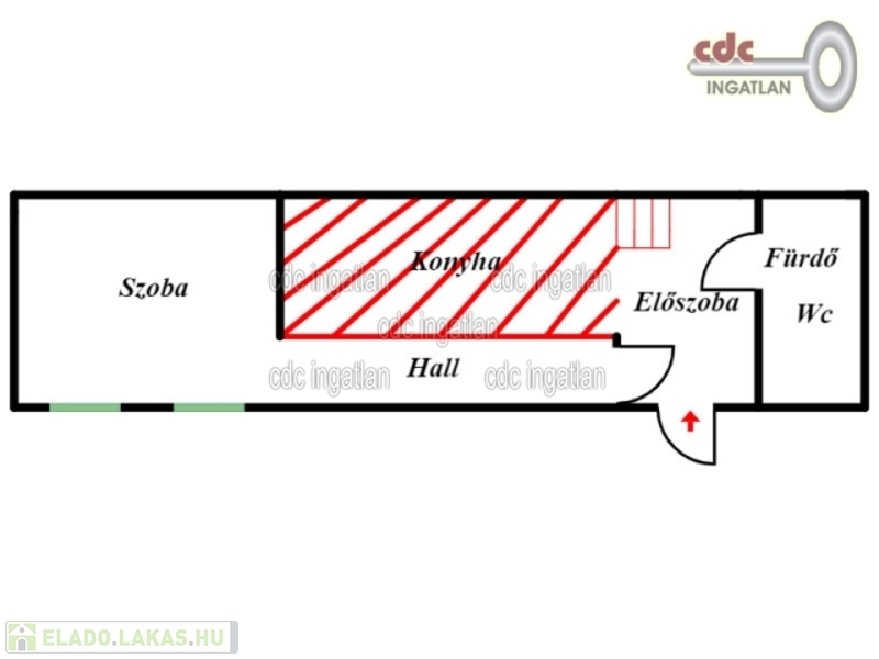 A lakás a következő helyiségekből áll: tágas, világos szoba (20 nm), fürdőszoba káddal és WC-vel (3 nm), hall (7 nm), közlekedő (10 nm) és felette a galérián a konyha (10 nm). A szoba ablakai a ház tágas, világos és csendes belső udvarára nyílnak. A lakás belmagassága 4 méteres, ezért kerülhetett kialakításra a konyha a közlekedő feletti részen. A nagy belmagasság miatt további lehetőség nyílik a szobában állógaléria építésére is.