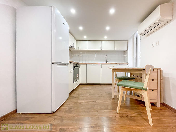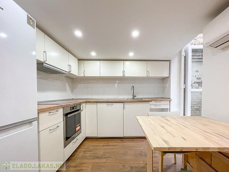A bútorok a vételár részét képezik, beleértve a gépesített konyhaszekrényt (hűtőszekrény, szag- és páraelszívó, mosogatógép, főzőlap, sütő).