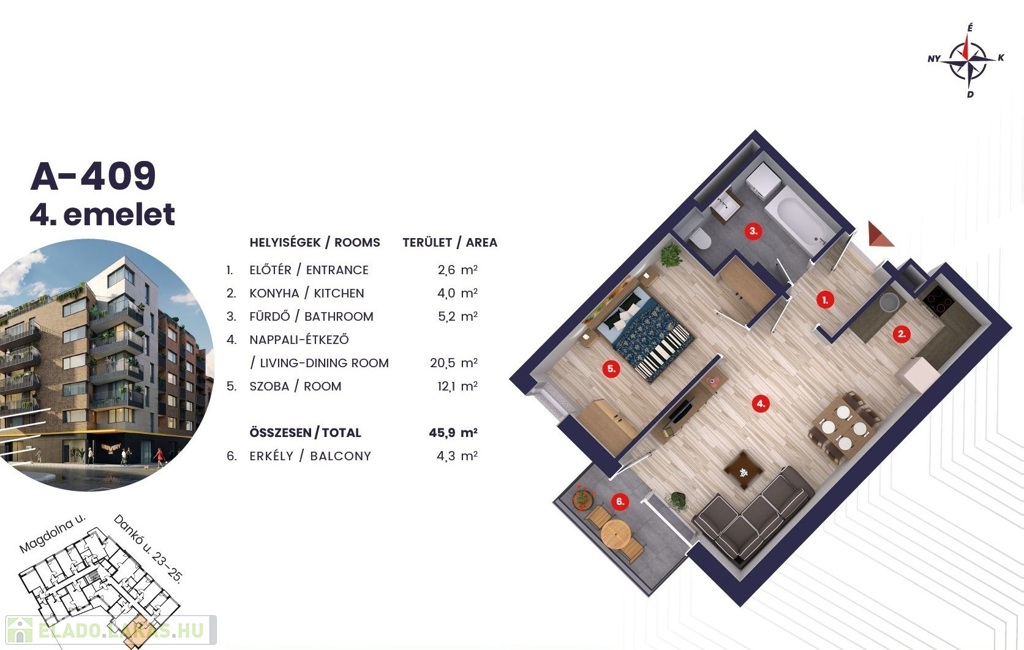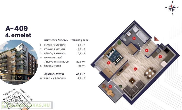 A 46 m2 alapterület és a 1,5 szobás elrendezés optimálisan kihasználható életteret biztosít.