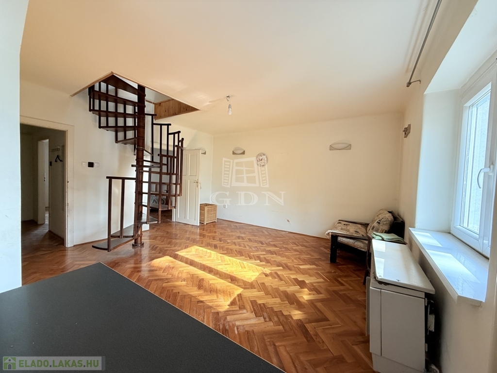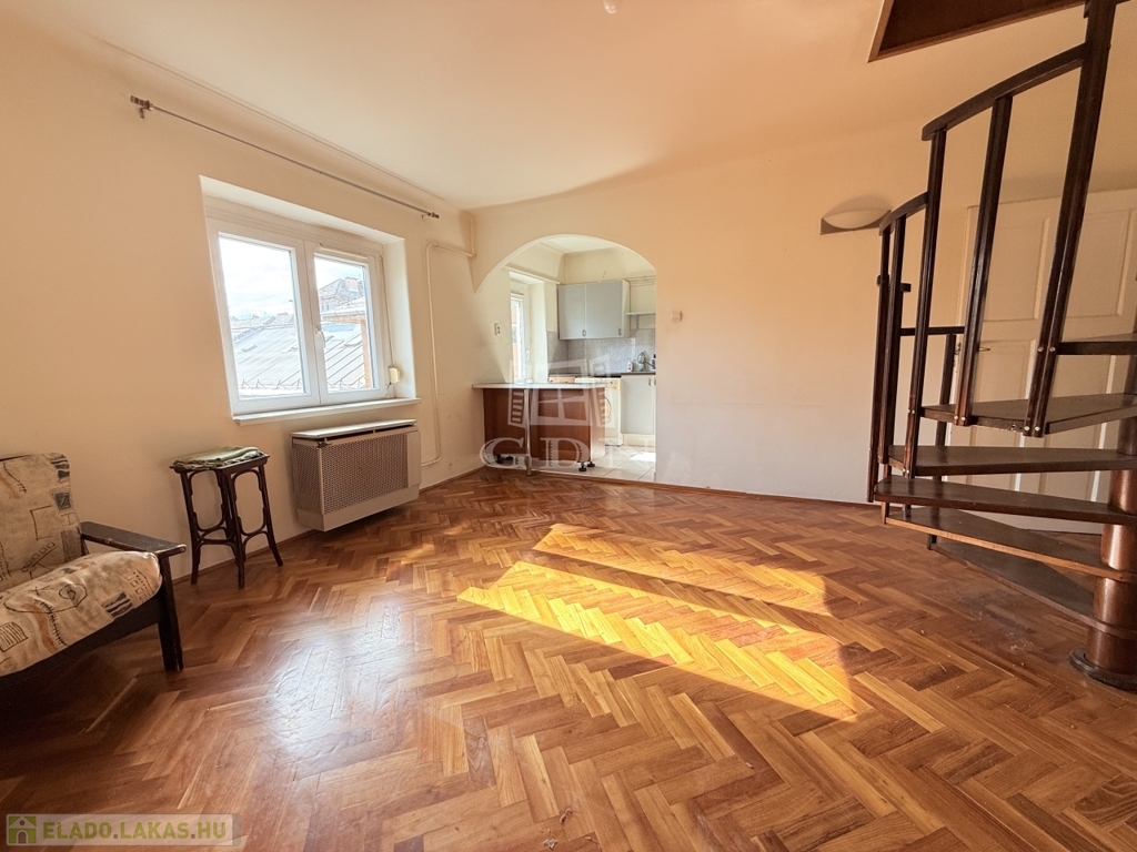 Titkos favorit a zavaros ingatlanpiac sokaságában, Zugló és Józsefváros határán a Puskás aréna mellett kiemelkedő infrastruktúrával. Ha szeretne központi elhelyezkedéssel egy kiváló, lakható, de akár könnyen bérbeadható társasházi lakást megfizethető áron akkor érdemes ezt az ingatlant személyesen is felfedeznie. Csupán 4 megállónyira (7perc metró) a Deák Ferenc tértől, Stadionok metró megállótól séta távolságban, madárcsicsergős, zöld és békés környezetben Stróbl Alajos utcában található az ingatlan. Elkerített zárt kertben áll az a 6 lakásos lépcsőház melyben a legfelső, második emeleten helyezkedik el ez a különleges, sallangoktól mentes duplex lakás. Az összes ablaka a csendes belső kert irányába néz és napkeltétől napnyugtáig világos, fényárban úszik. Az épület rendezett, a tetőt 10 éve újították fel új cserépfedést kapott, egyidejűleg velux ablakok kerültek beépítésre a felső szinten és az alsó szinten is műanyag ablakok váltották a fa nyílászárókat. Az alsó szinten az előszobából nyílik az összes helyiség, egy tágas háló, mellette egy praktikus kamra /dolgozó ablakkat és a fürő illetve a külön wc kapott helyet a konyha nappali mellett. A konyha – étkező és nappali jelenleg egy egység, de az ablakok elhelyezkedésének köszönhetően akár újra külön választhatóak. A nappaliból vezet fel egy csigalépcső, ahol további két hálószoba (ablakokkal)található, igény esetén a felső szint is alkalmas egy zuhanyzó és mosdó elhelyezésére. Az alső rész 47m2 a felső pedig bruttó 56m2 , a földhivatali nyilvántartás szerint 77m2, az értékesítési alapterületkén a 190cm alatti területet a szokásos 50%-kal került feltüntetésre. Fűtését tekintve jelenleg gázkonvektor, ami akár egy mika kazánra is cserélhető. Igény esetén a fűtés hőszivattyús klímákkal is megoldható opcionálisan H tarifával párosítva. A lakást immár 6 évig bérlő lakta, azonnal birtokba vehető az ingatlan. A környéken minden megtalálható, ami városi mindennapok kényelméhez elengedhetetlenek. Könnyen parkolhatóak a környező utcák, kiváló tömegközlekedési lehetőségek állnak rendelkezésre. Az aréna pláza csupán 900m távolságra. Tökéletes lehet akár nagyobb családok részére, de bérbeadás is korrekt hozamot hoz a stabil ingatlan ár növekedés mellett így magas inflációs környezetben értékálló befektetés.