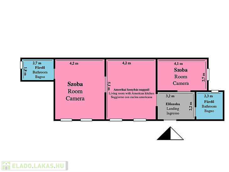 A 70 nm-es lakás 3 szobával, 2 fürdőszobával és 2 mellékhelyiséggel rendelkezik.