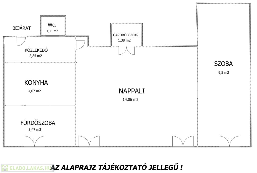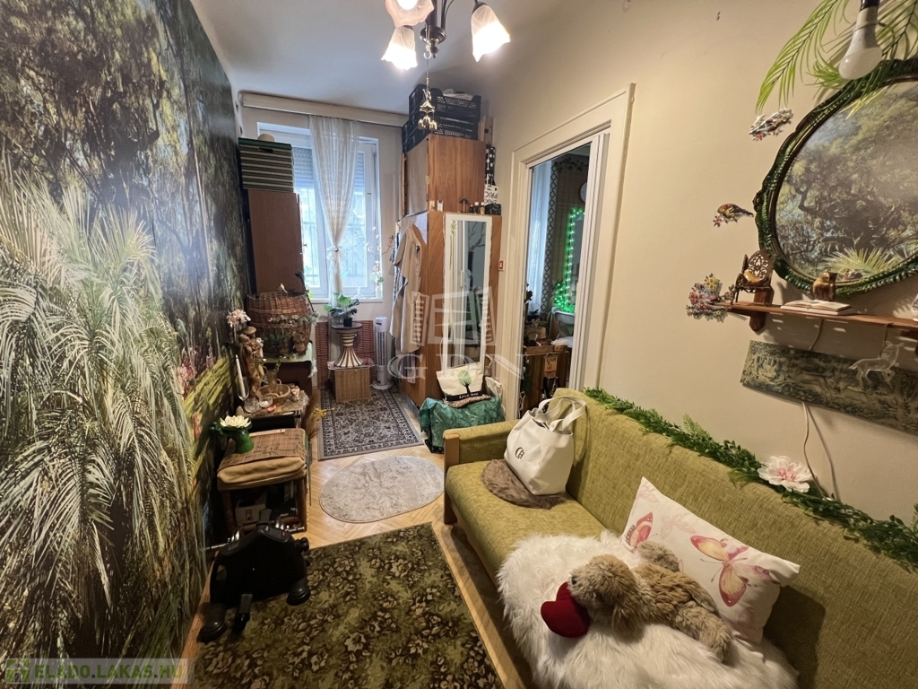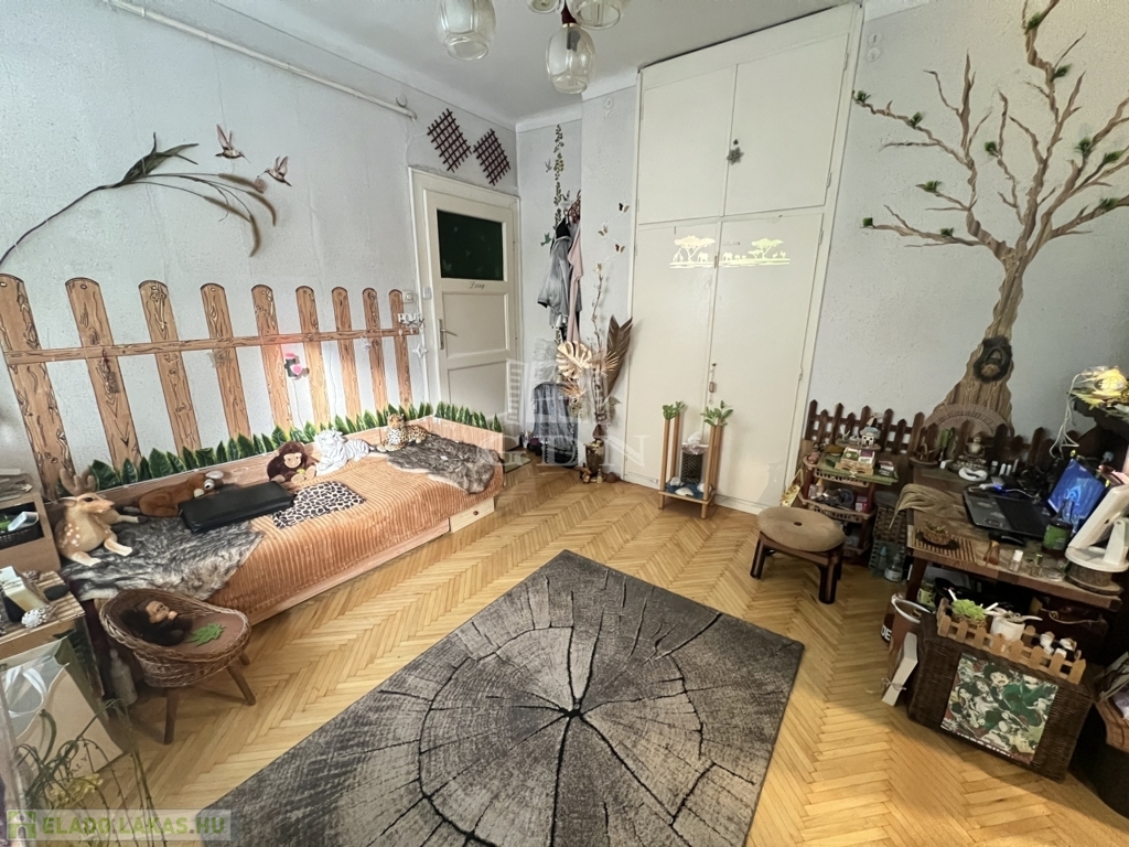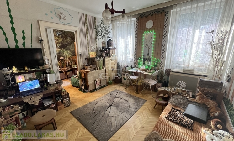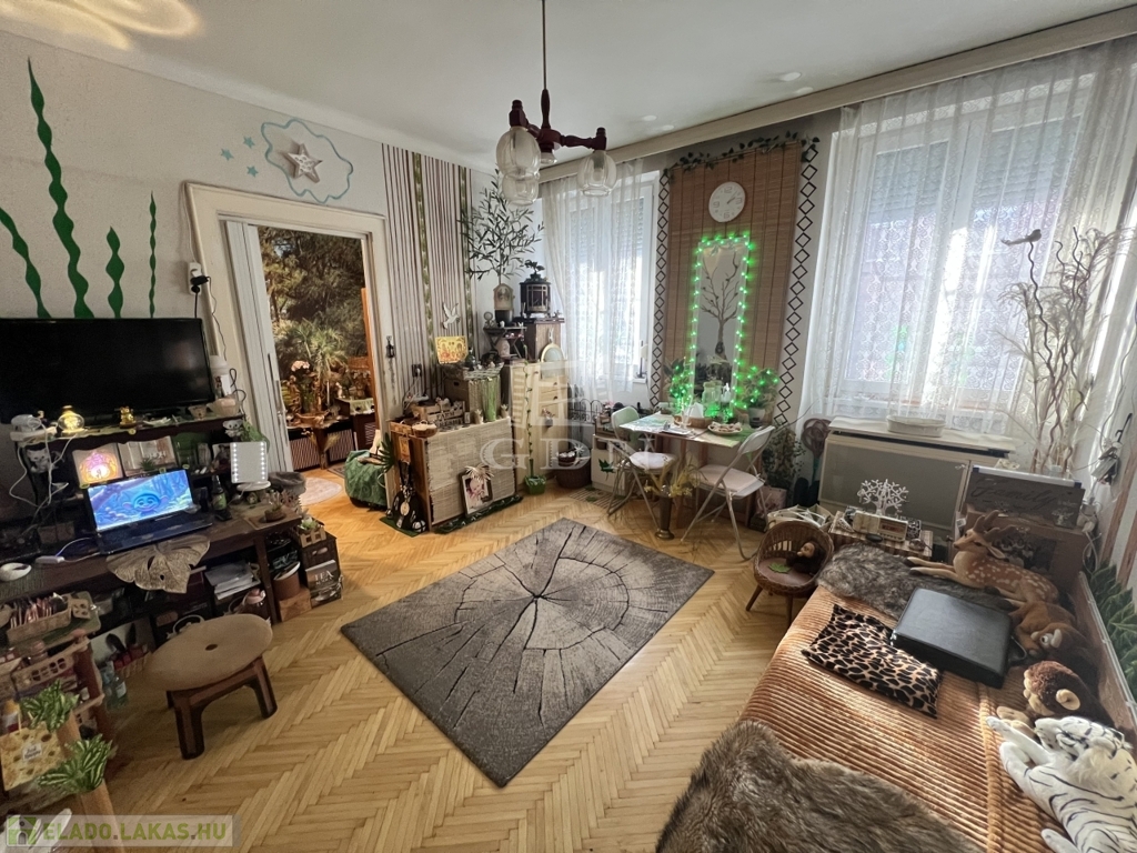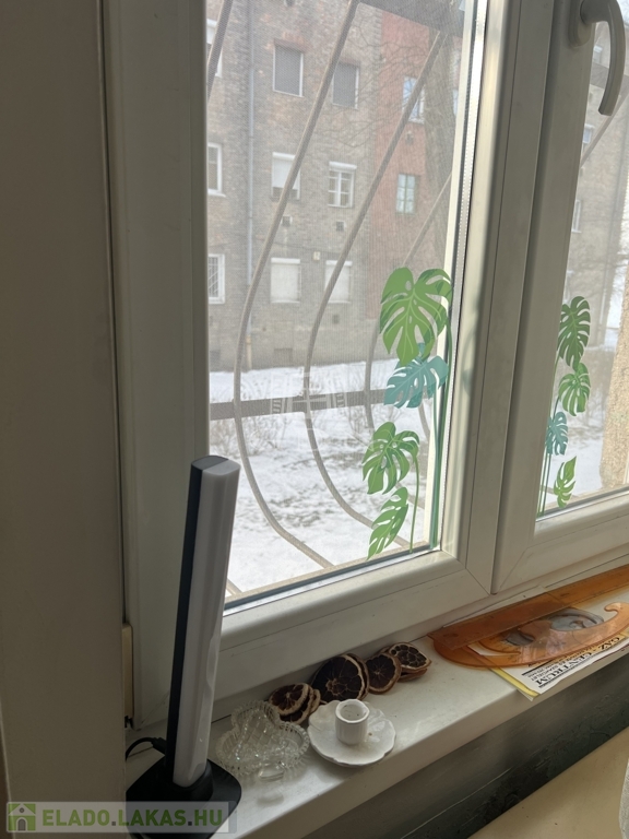 Méretek és a jelenlegi elrendezése az alaprajzon látható, tájolása D-Ny-i, belső parkra néz a lakás.