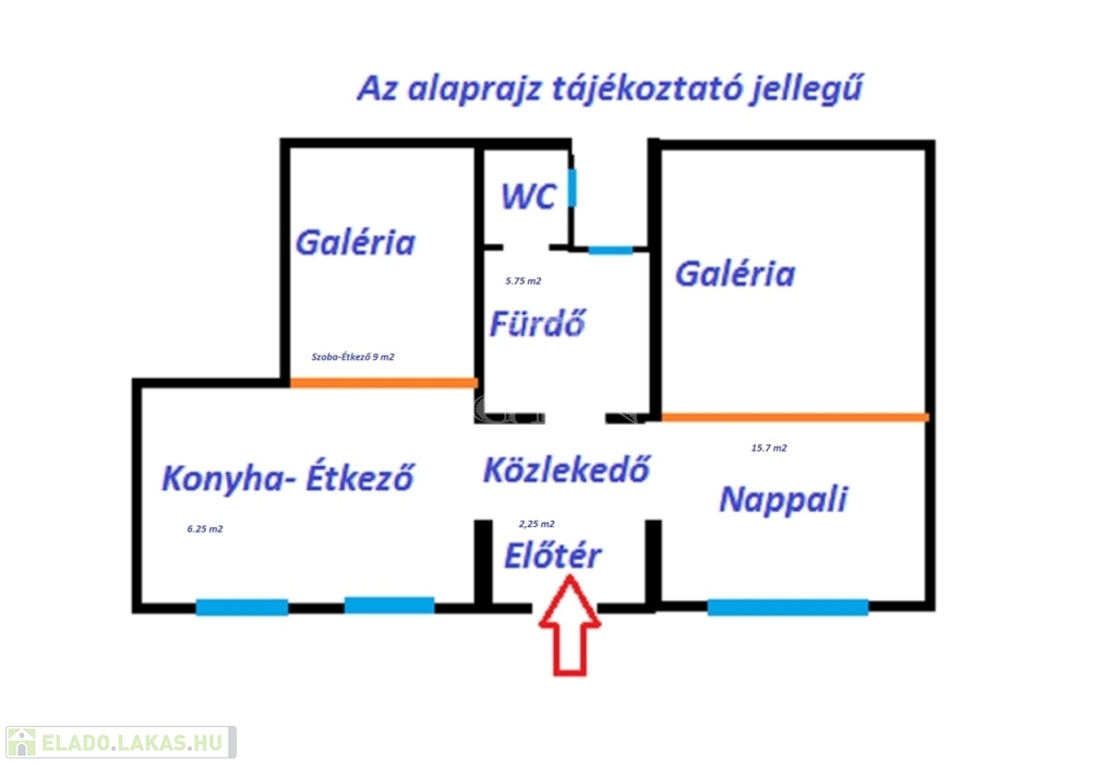 A LAKÁS RÉSZEI: nappali - galéria, egy szoba - galéria egyben, konyha, étkező, fürdőszoba- WC külön helységben található.