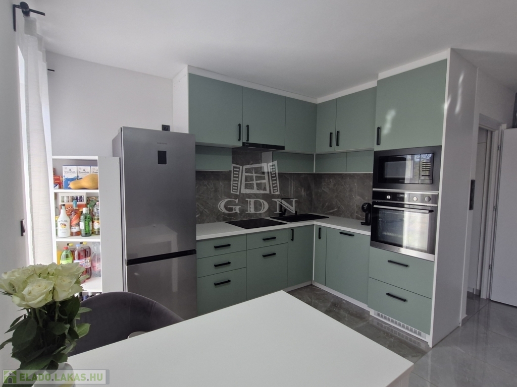 -beépített konyhabútor (egyedi tervezés, prémium alapanyagok, felszereltség: Electrolux sütő, Electrolux főzőlap, Teka elszívó, Samsung beépített mikrohullámú sütő, Gránit mosogatótálca, Electrolux mosogatógép)