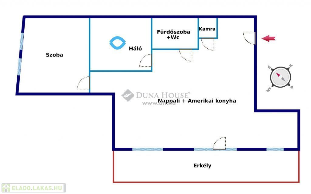 A lakás központi életterét egy 46m2-es, amerikai konyhás nappaliszoba adja. Minden további helyiség, azaz két háló, egy fürdőszoba + wc, és egy kamra helyiségek is innen megközelíthetőek, mind külön bejáratúak. A nappaliból a 16m2-es, tágas erkélyre is kiléphetünk. Itt akár egy kiülő rész, és egy elektromos grill is kényelmesen elhelyezhető.