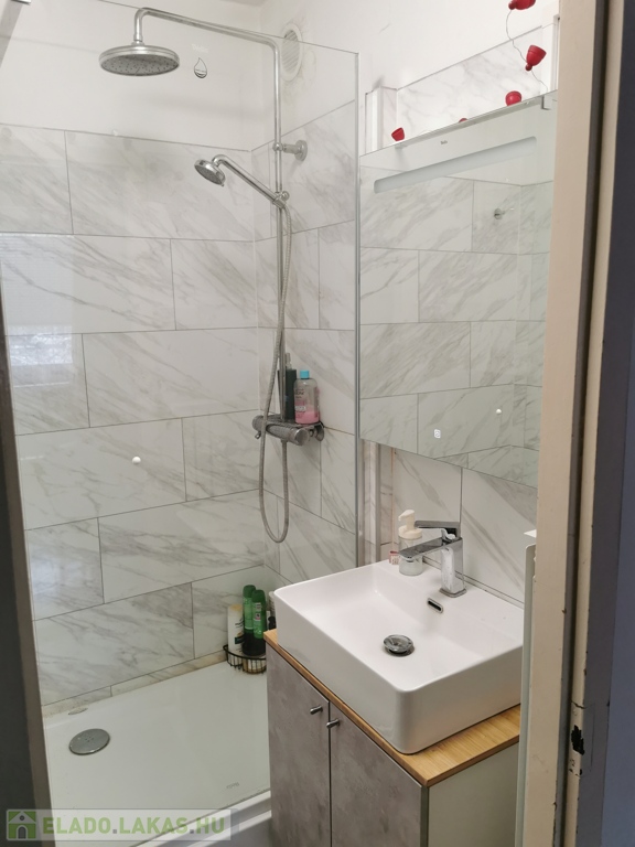 - Fürdő: Wellis szaniterekkel felszerelt vizesblokk, modern, épített zuhanyzó (kád nélküli kialakítás).