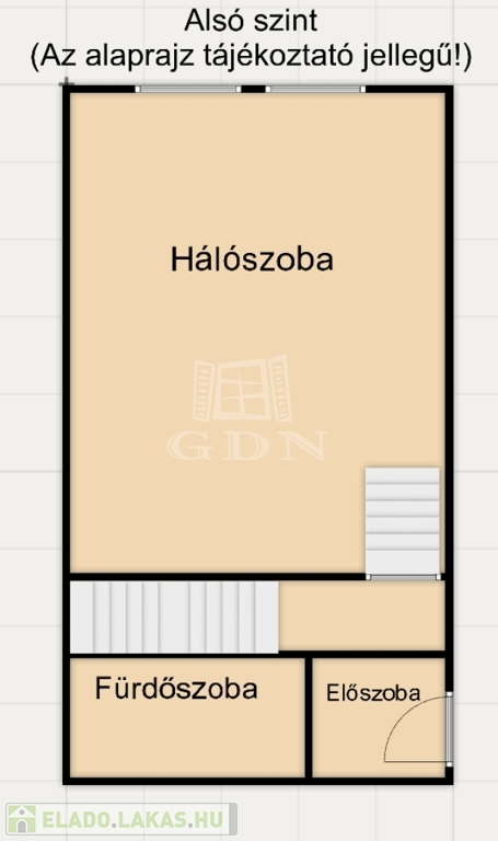 Az alsó szinten található a hálószoba és a fürdő, az emeleti szinten pedig egy tágas nappali kapott helyet – ideális elrendezés kényelmes mindennapokra.