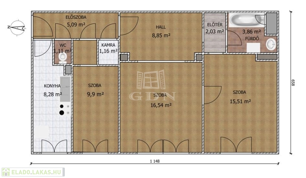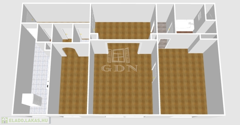Az elrendezése praktikus és jól alakítható, a három szoba és a tágas hall lehetőséget ad családoknak, otthoni munkára, vagy akár egy kis dolgozósarok kialakítására is.