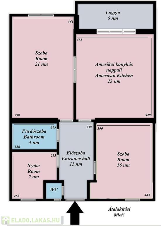 - Elosztás: jelenleg 2,5 különnyíló szoba, konyha, fürdő, külön WC
