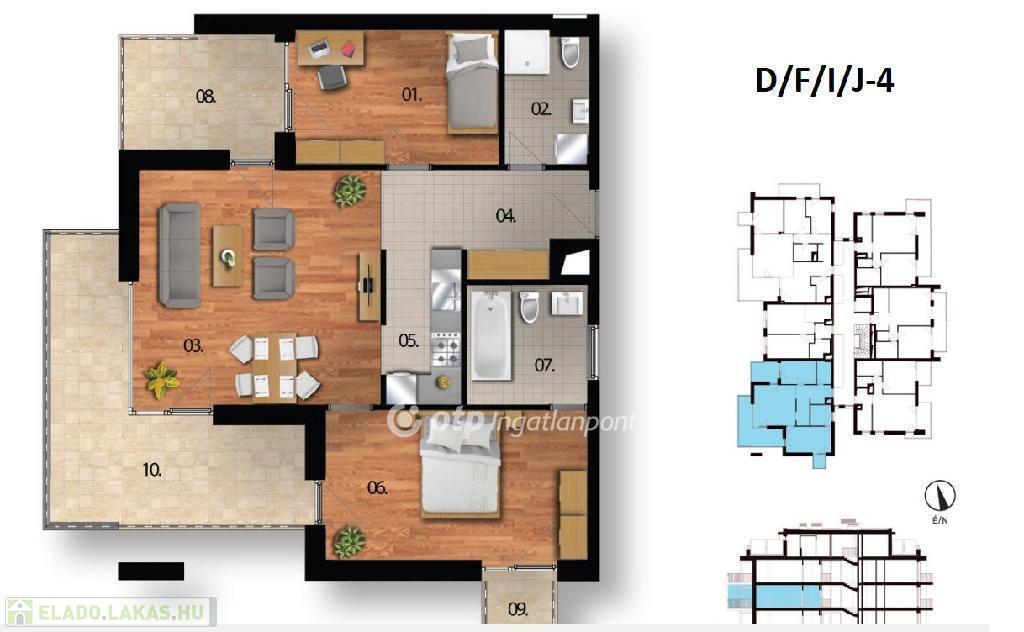 Lakások mérete: 43 nm-es, 1,5 szobás lakástól a 150 nm-es, 5 szobás és a tetőteraszos, exkluzív penthouseig.