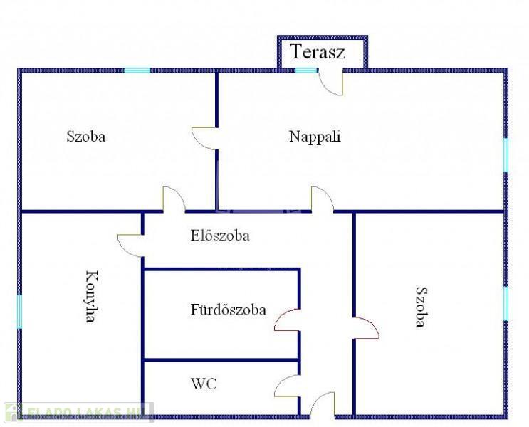 előszoba, konyha+étkező, WC, fürdőszoba+WC, nappali, 2 szoba, erkély(3m2).
