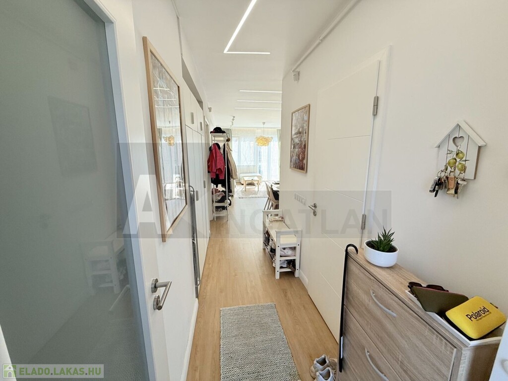 Elrendezését tekintve: a lakás központi része , az amerikai konyhás nappali , magasfényű konyhabútorral , kiváló háztartási gépekkel és a két hálószoba , két fürdőszobával és a napfényes 7m2-es , erkély , mely abszolút ideális a reggeli kv vagy akár az esti vacsora helyszínéül...