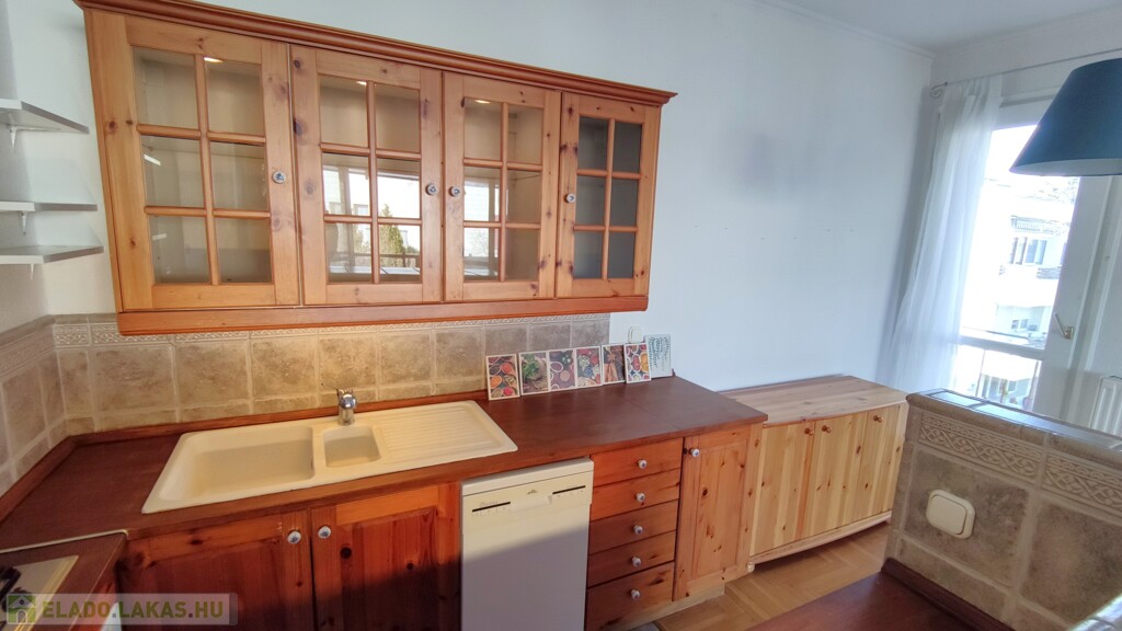 A konyha beépített szekrényekkel, gáztűzhellyel, sütővel, elszívóval, mosogatógéppel, beépített hűtővel, fagyasztóval felszerelt.