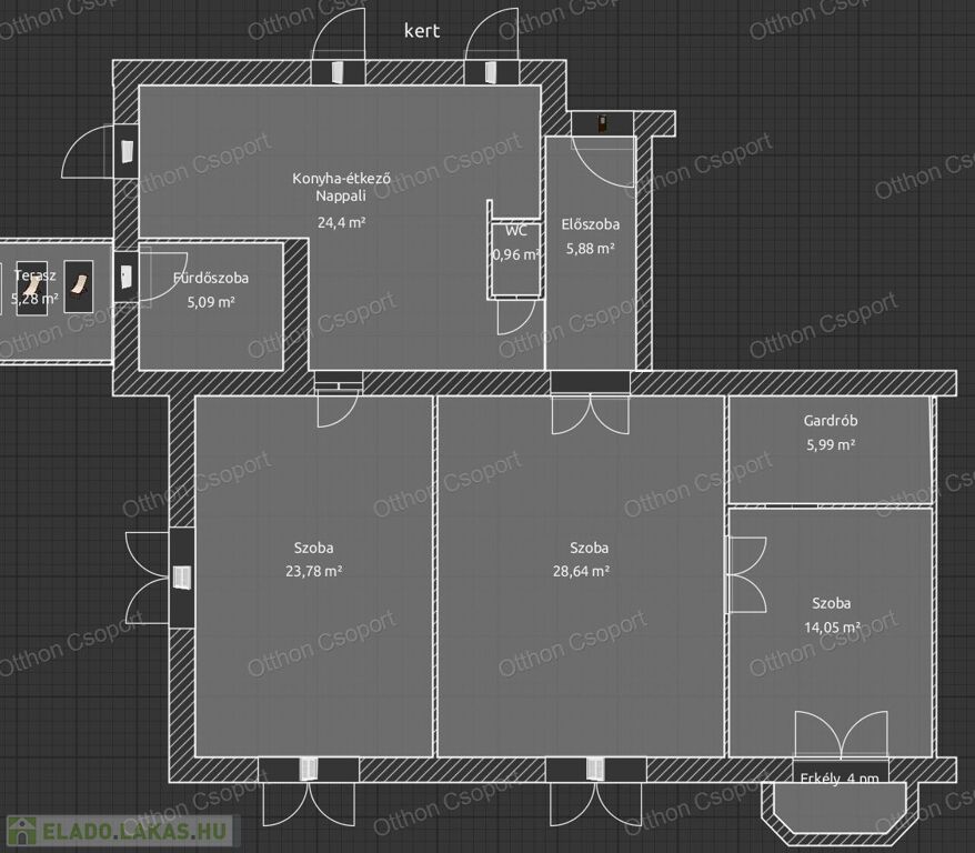 Előszoba, étkező konyhás nappali, plusz három szoba; ez utóbbi könnyen 3 és fél szobává alakítható, de átalakítással több lehetőségre is van mód. Belmagasság 3,10 m.