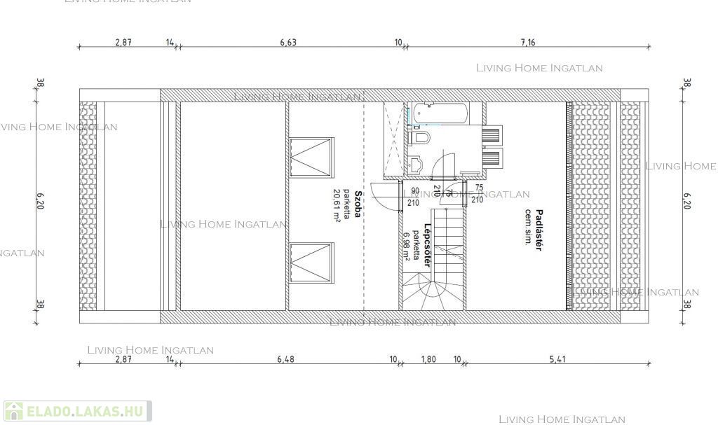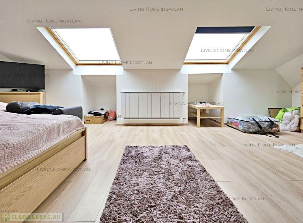 Emelet: Nagy hálószoba, fürdőszoba, méretes tároló a padlástérben.