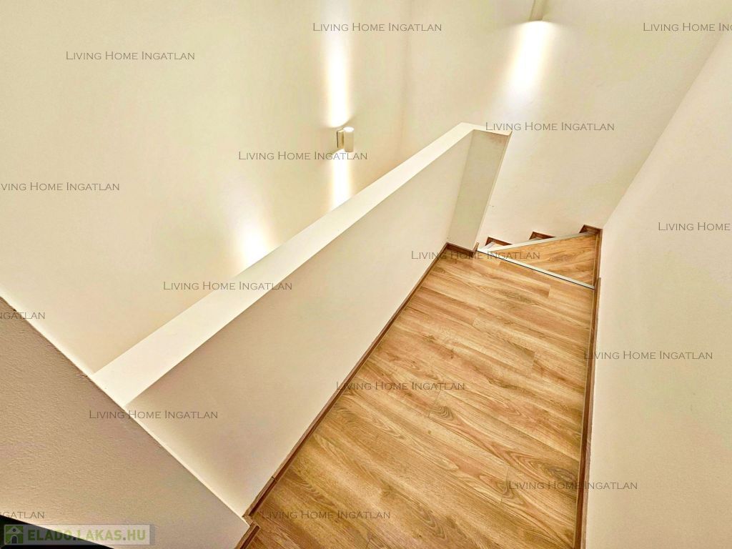 Alsó szint: előszoba, amerikai konyhás nappali, háló, fürdőszoba, külön WC.