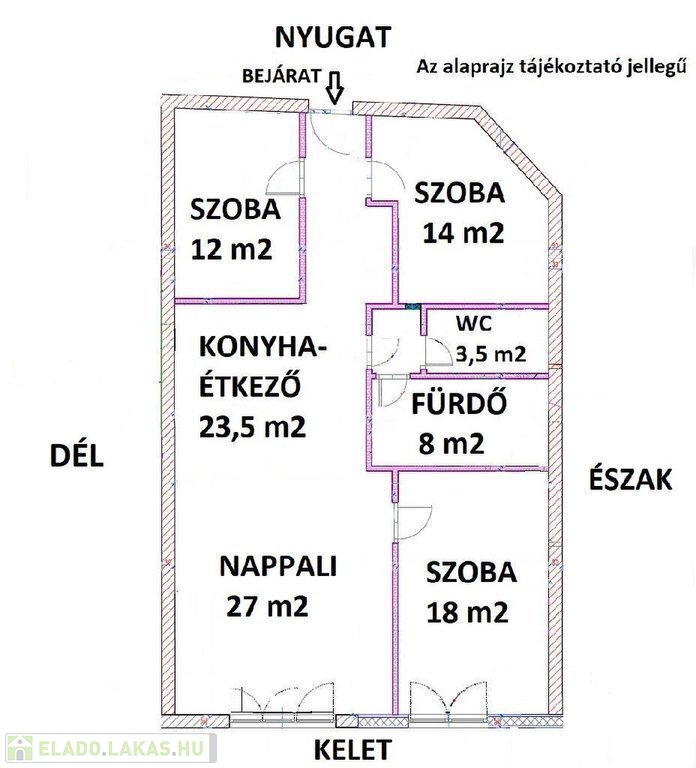 A lakás keleti tájolású, két hálószobában tetőablak biztosít természetes fényt a nap későbbi szakaszában is.